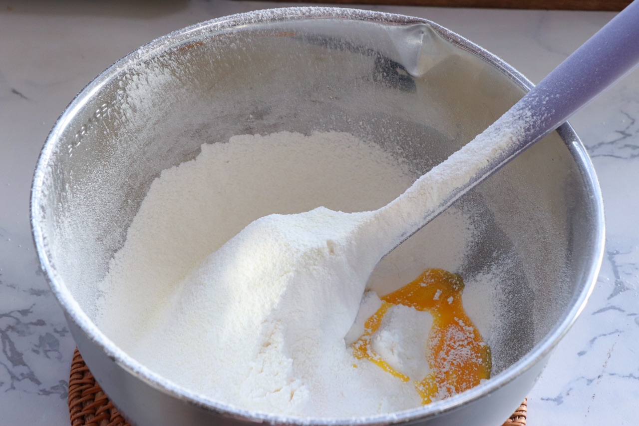 辅料:糖粉60克、蛋液24克、奶粉24克、吉士粉24克、低筋面粉176克、麻薯、糯米粉50克、水65克、水怡28克、炼乳12克、黄油15克