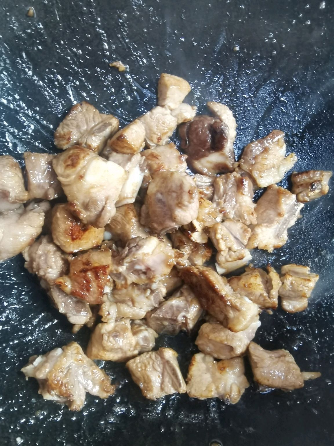 步骤6、排骨炒到表面,焦黄下葱姜蒜爆香