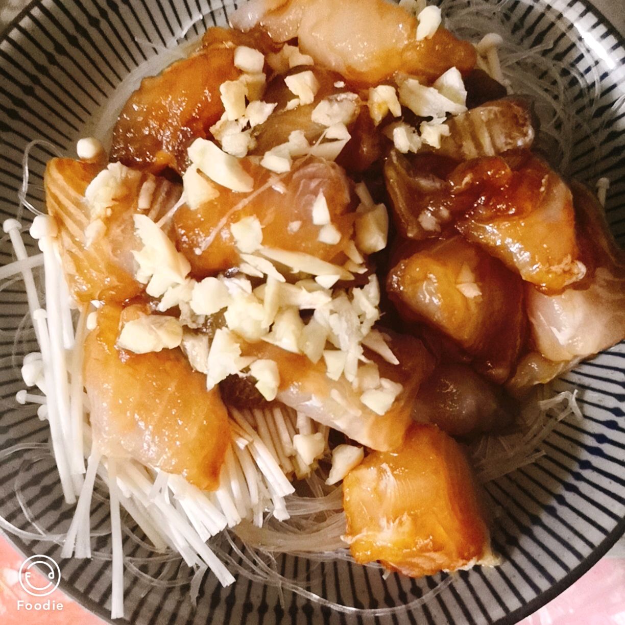 步骤4、粉丝,金针菇铺底下,放上鱼,最上面是蒜末。