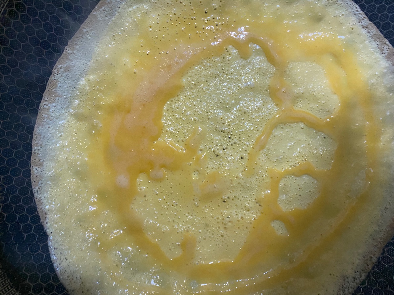 步骤5、摊的时候最好用器具压平一下,更好的粘合在一起