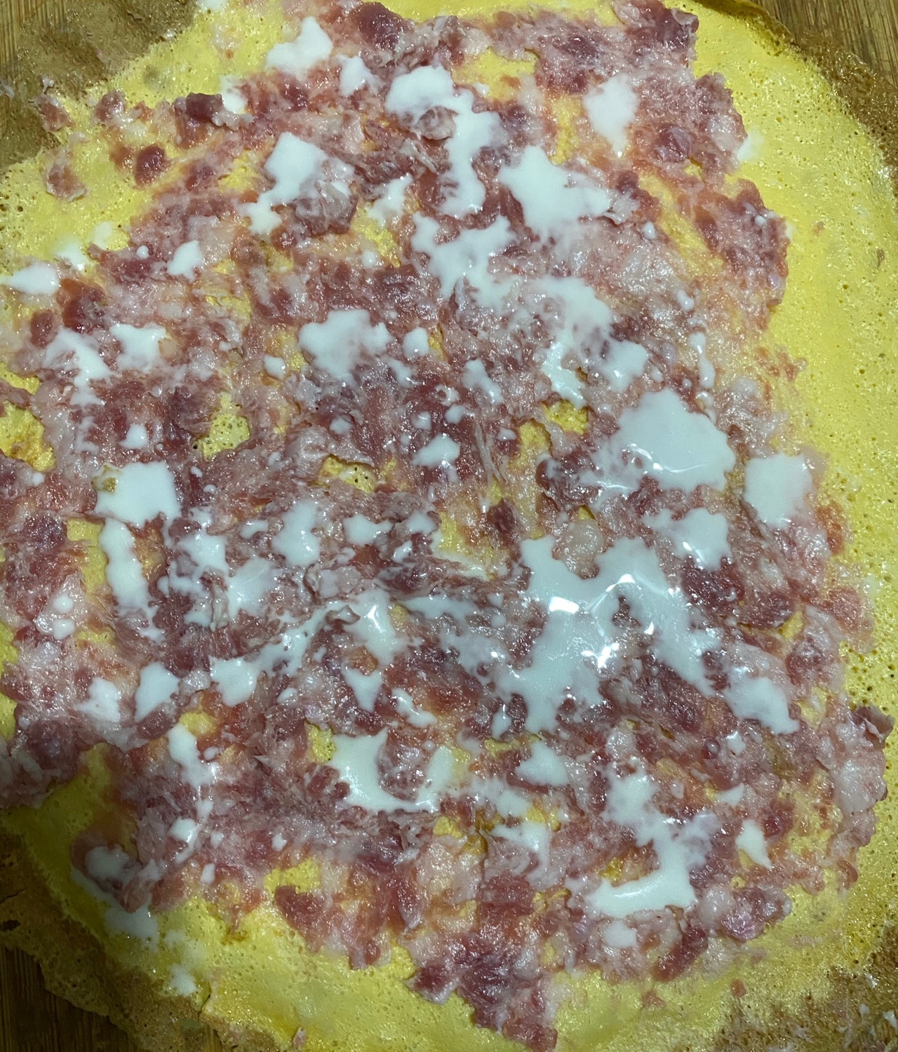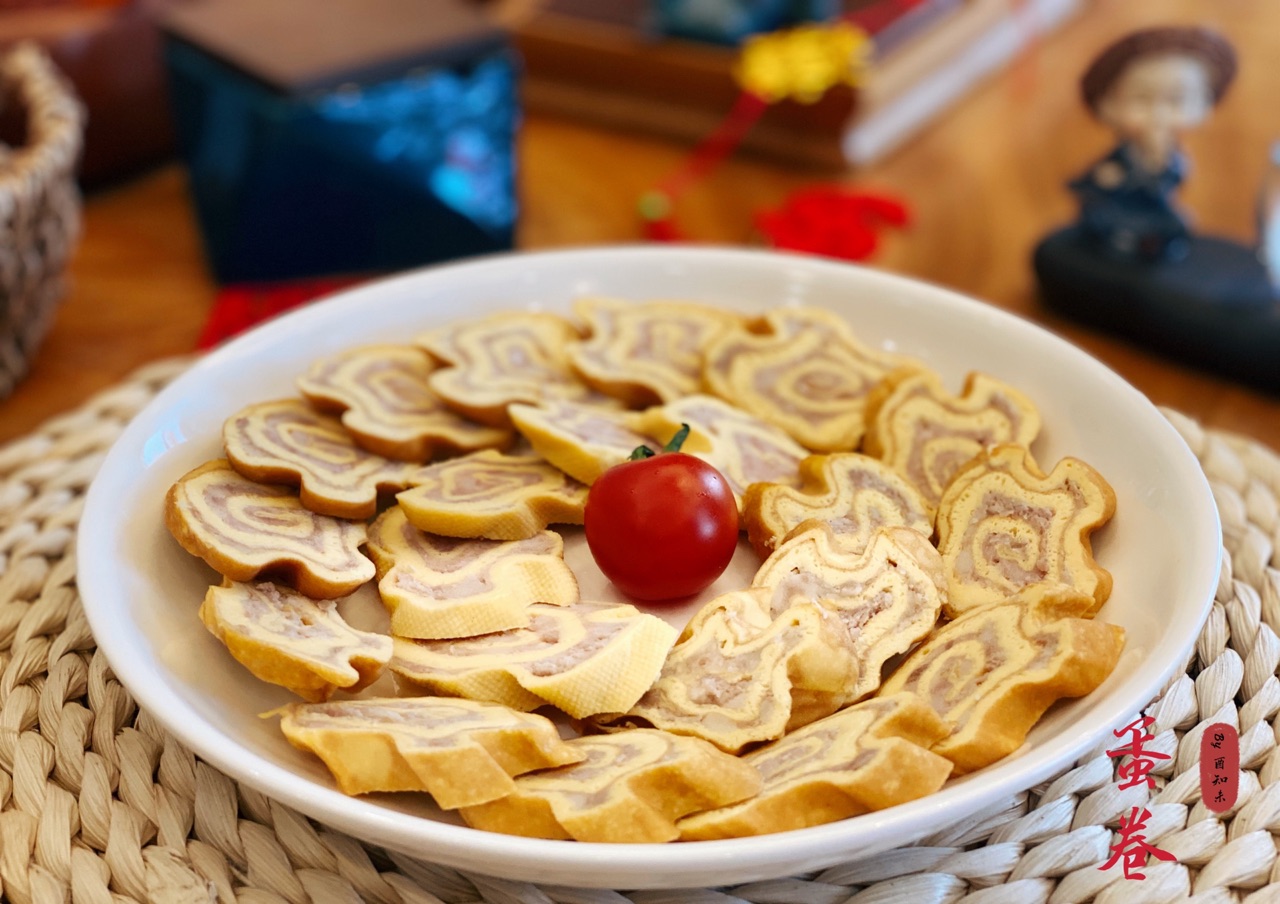 步骤4、摊好的蛋皮放置备用,把五花肉剁碎摊到鸡蛋皮上
