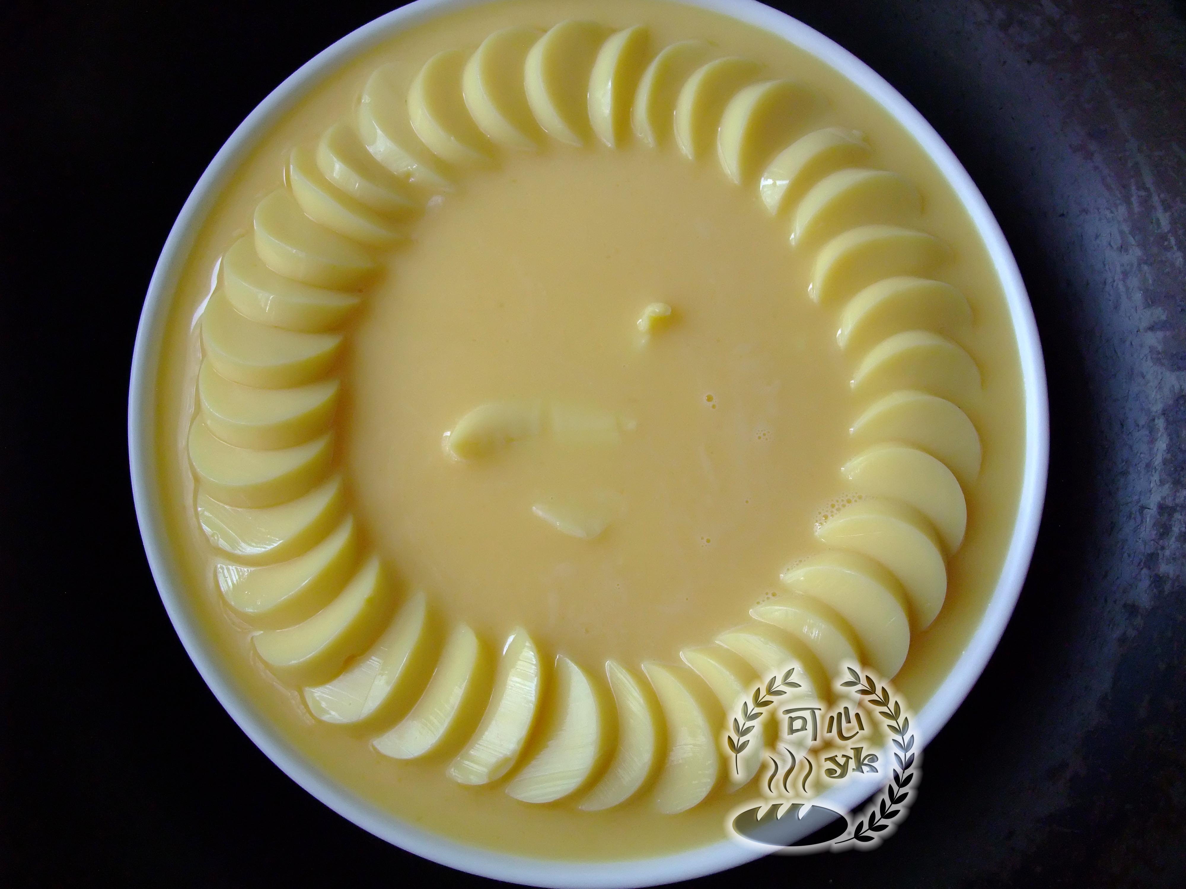 步骤8、将蛋液慢慢倒入盘中,不要将摆好的豆腐冲变形。水开后,中小火蒸6分钟。