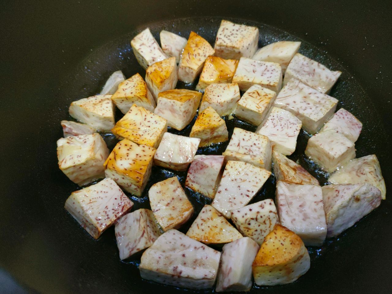 步骤13、锅里加食用油,把芋头放锅里煎到两面金黄装出备用。