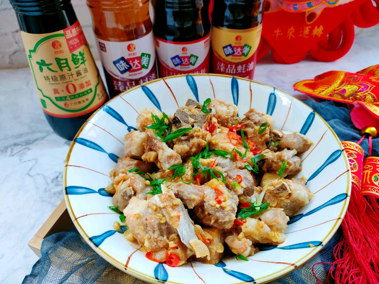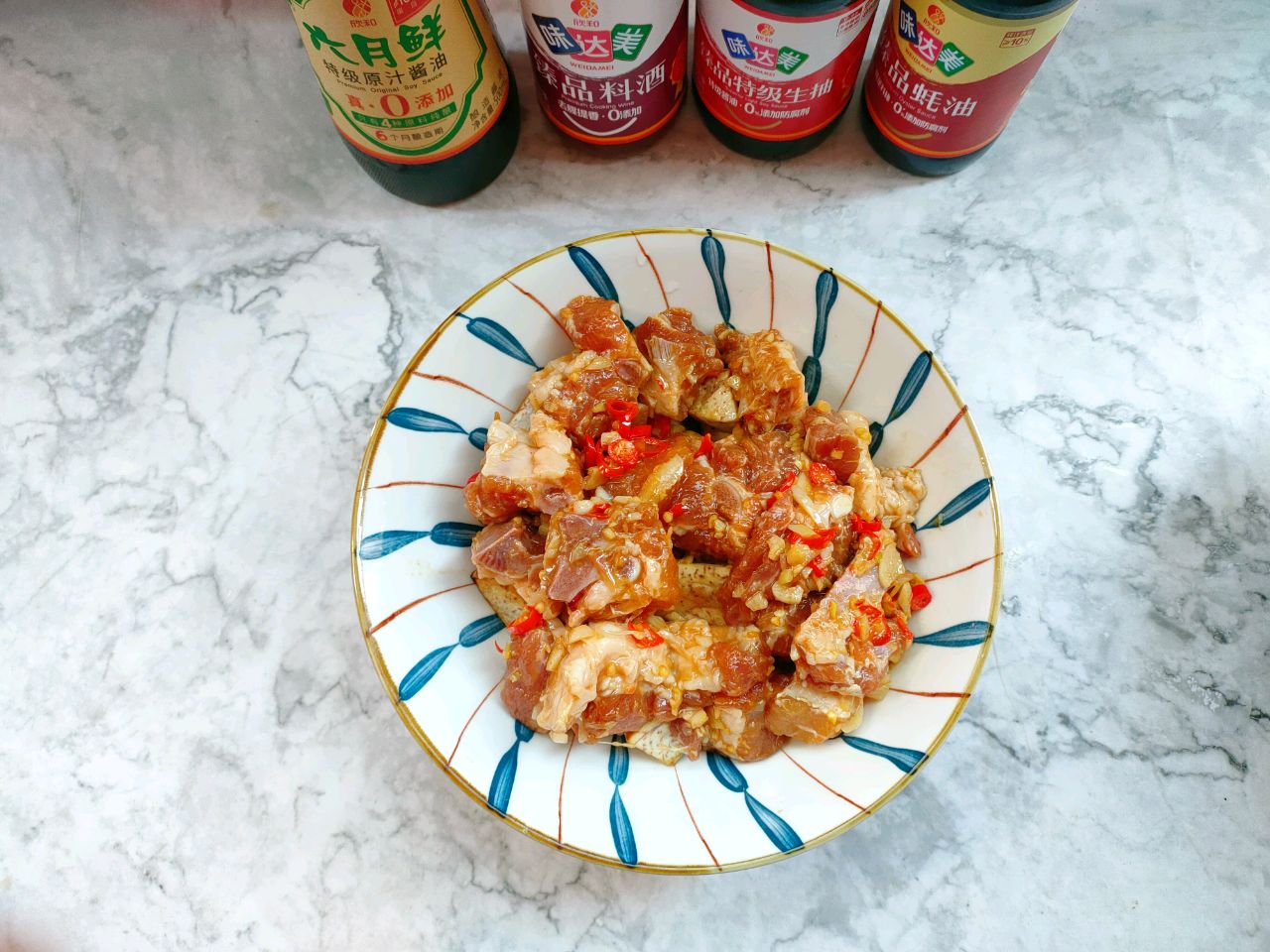 辅料:调料:、六月鲜特级原汁酱油1勺、味达美臻品特级生抽1大勺、味达美臻品蚝油1勺、味达美臻品料酒1勺、白胡椒粉小半勺、白糖小半勺、玉米淀粉1勺、小米椒2个、大蒜3瓣、生姜1块、葱1根、盐1勺