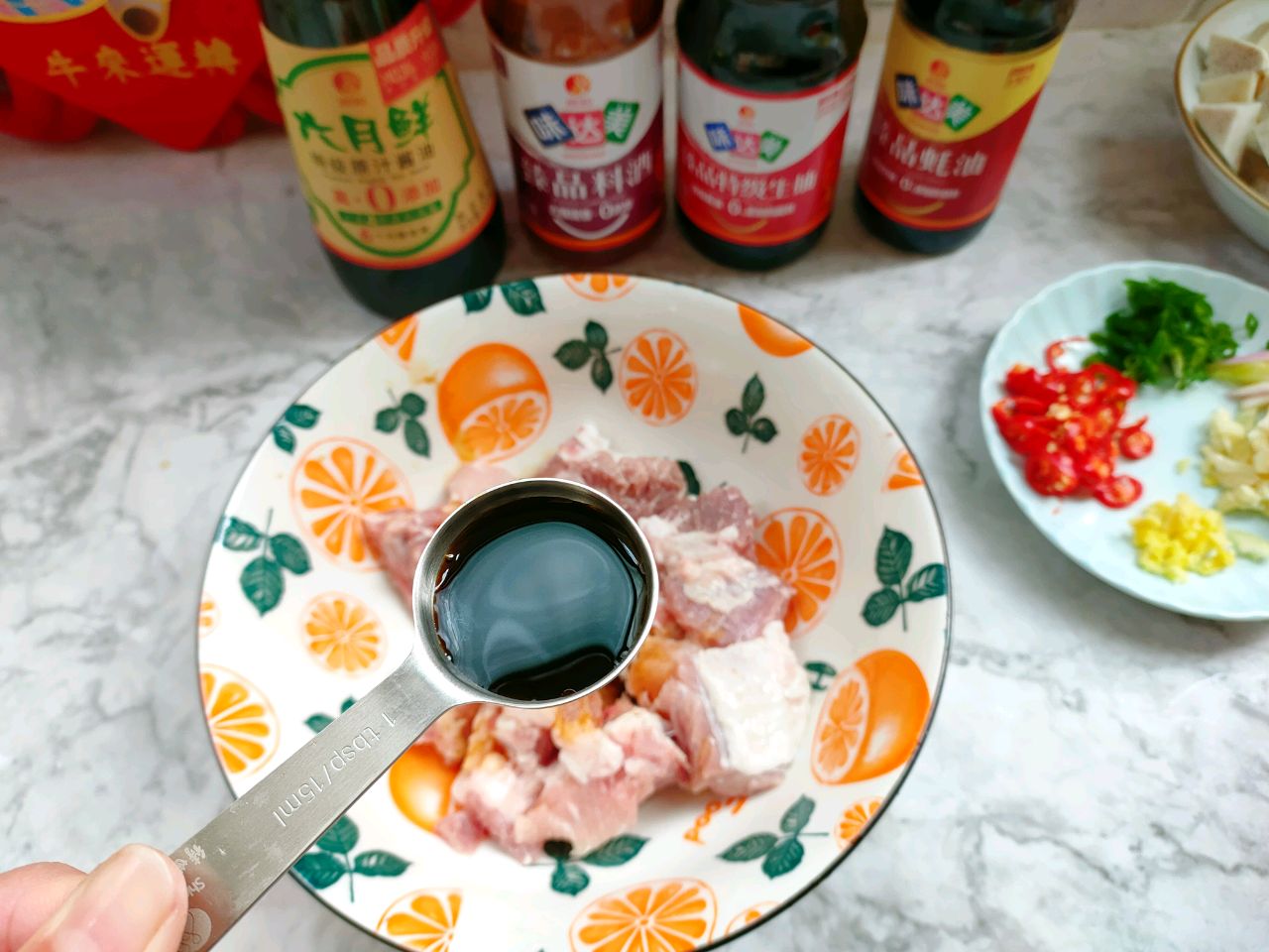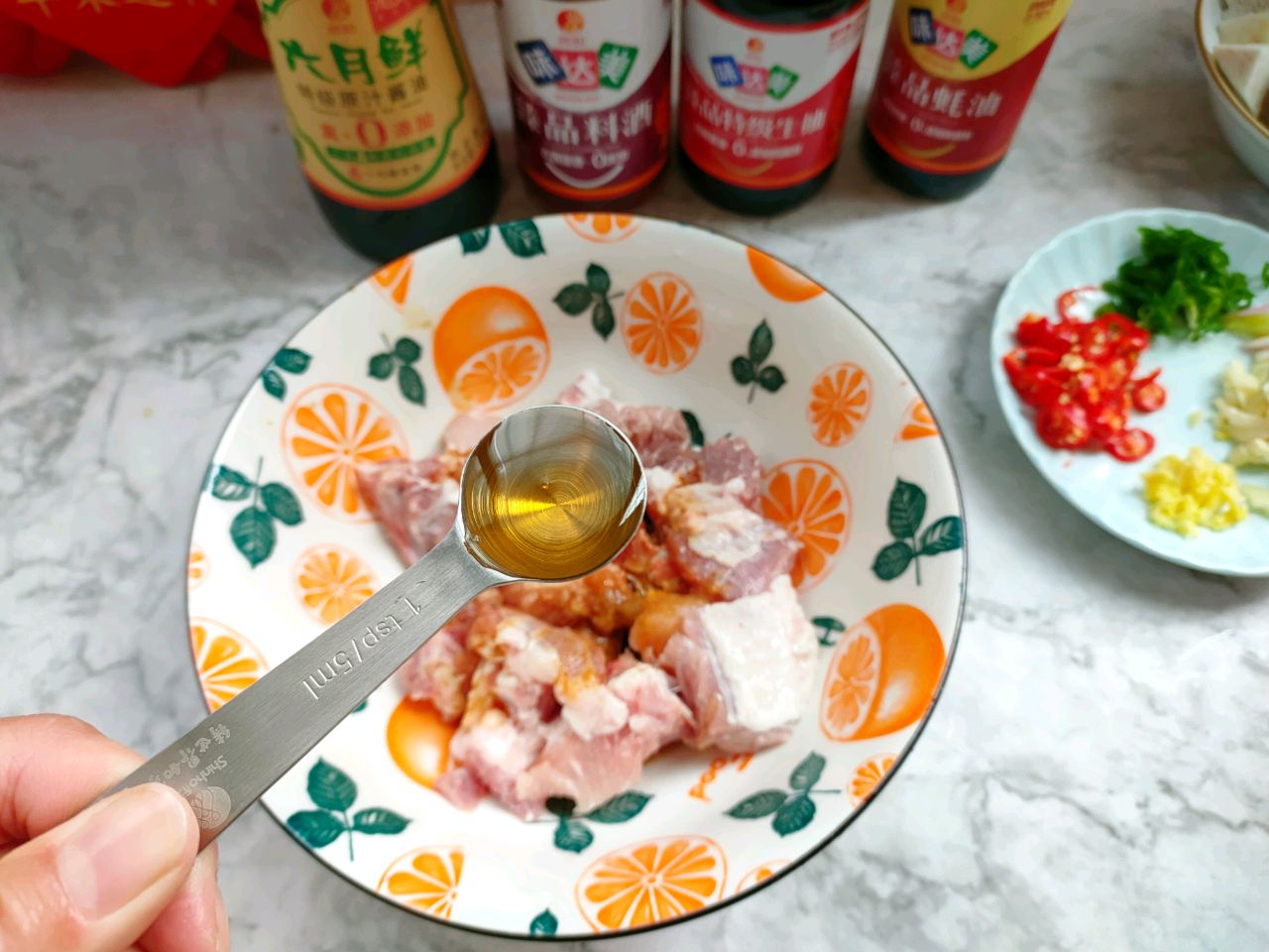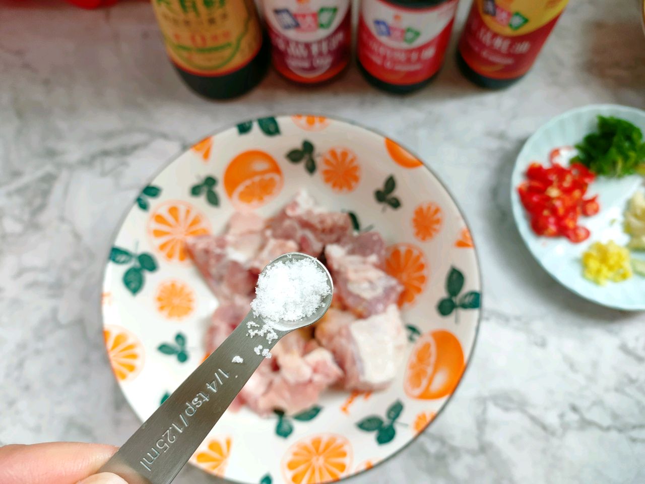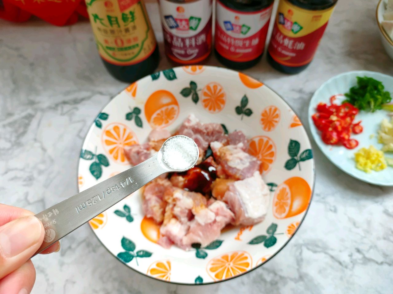 步骤12、腌制够时间的排骨加1勺玉米淀粉,抓均匀。