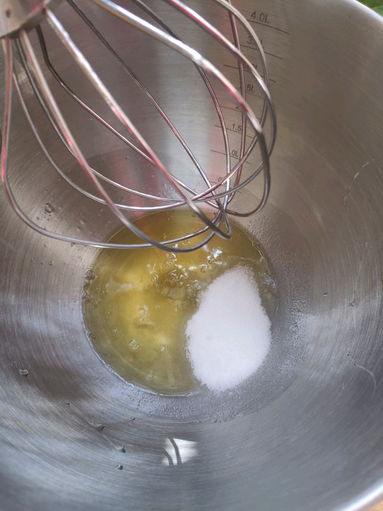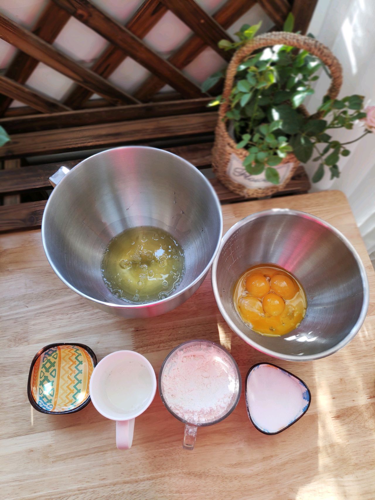 步骤1、牛奶108克玉米油75克低筋面粉135克白砂糖90克鸡蛋6个,六个蛋清与蛋黄分离淡奶油100克(加白砂糖10克)
