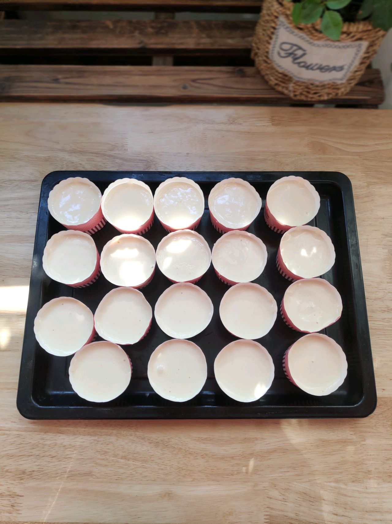 步骤9、记得将烤箱提前预热120度10分钟,预热结束之后将温度先120度20分钟,再转150度15分钟。这样的先低后高的温度不容易使成品的蛋糕粘湿