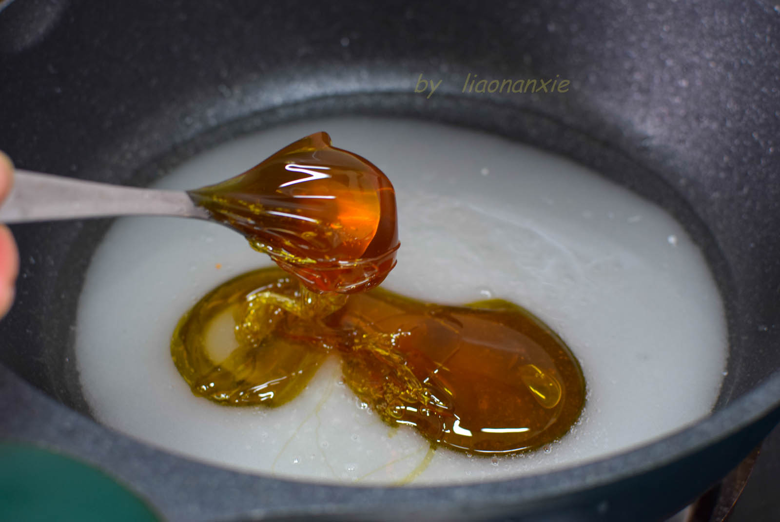 为了给自己留下更多的操作时间,糖汁煮开后即转成小火,虽然时间用得多一点儿,但成功的机率会更大一些。