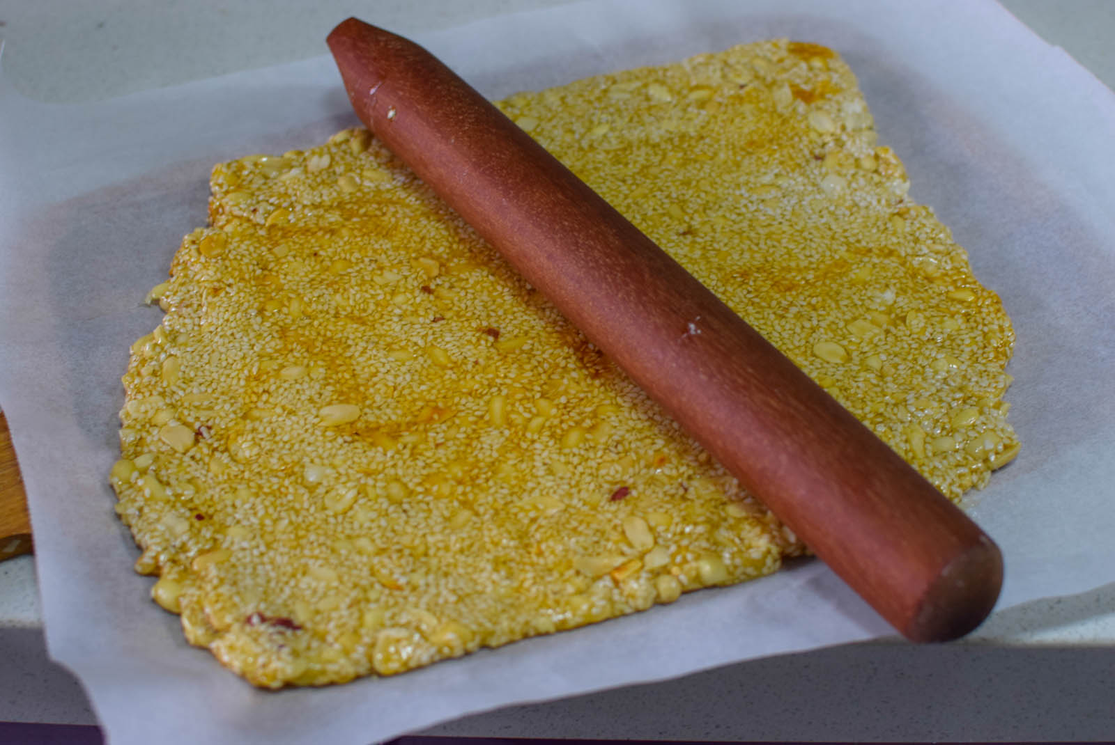 步骤8、拌好的芝麻花生糖倒在烘焙油纸上面,趁热用擀面杖擀成厚薄适中的片。