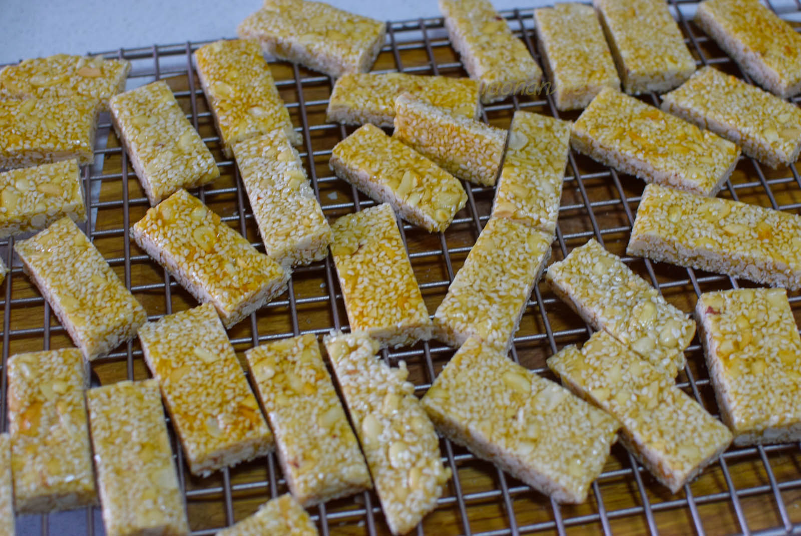 步骤9、稍后,等糖的温度降至温热还没有完全变硬的时候,用刀切成大小适合的块,香喷喷的麻糖就做好了。