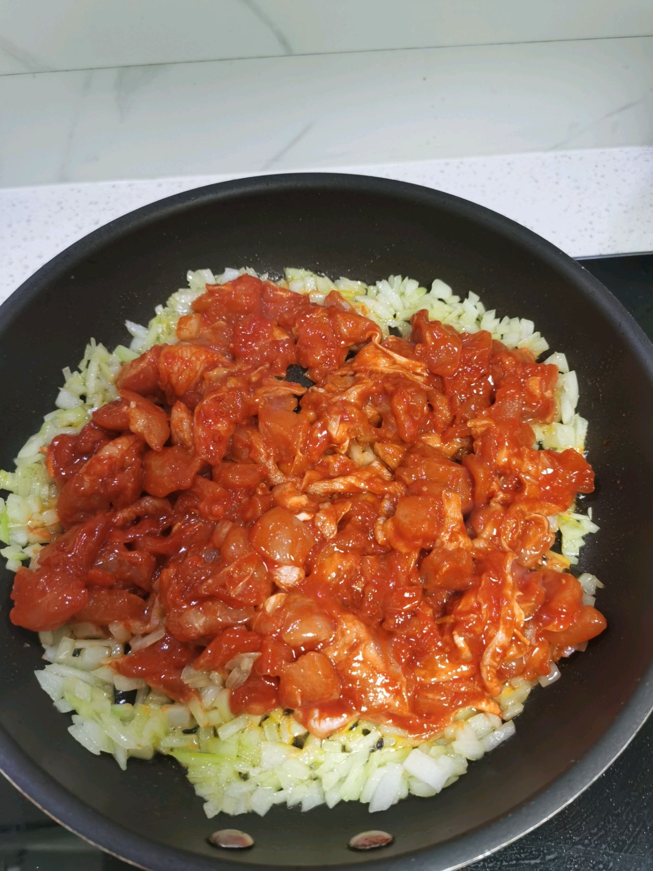 步骤6、然后加入腌好的鸡肉炒8分熟