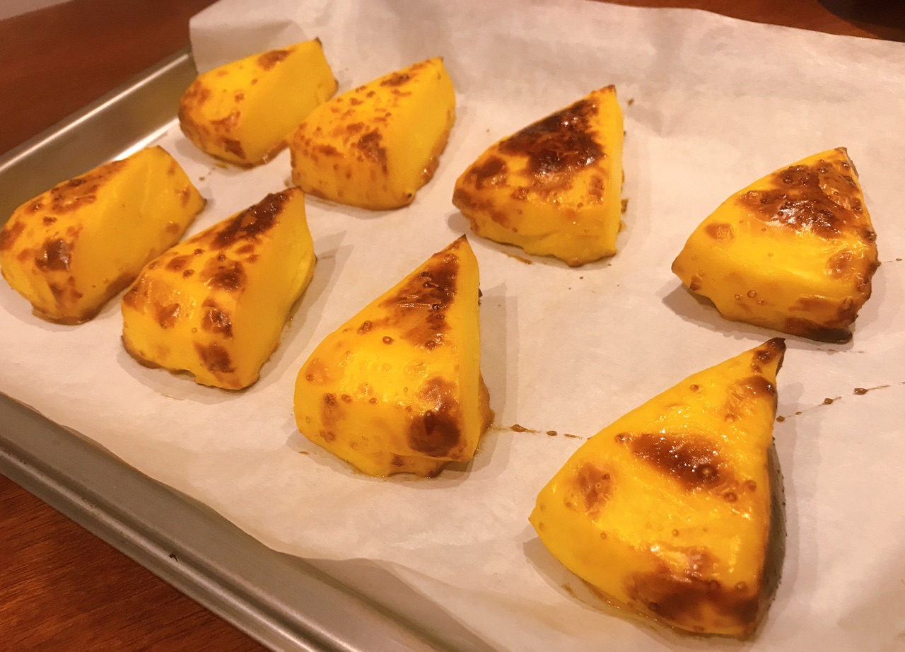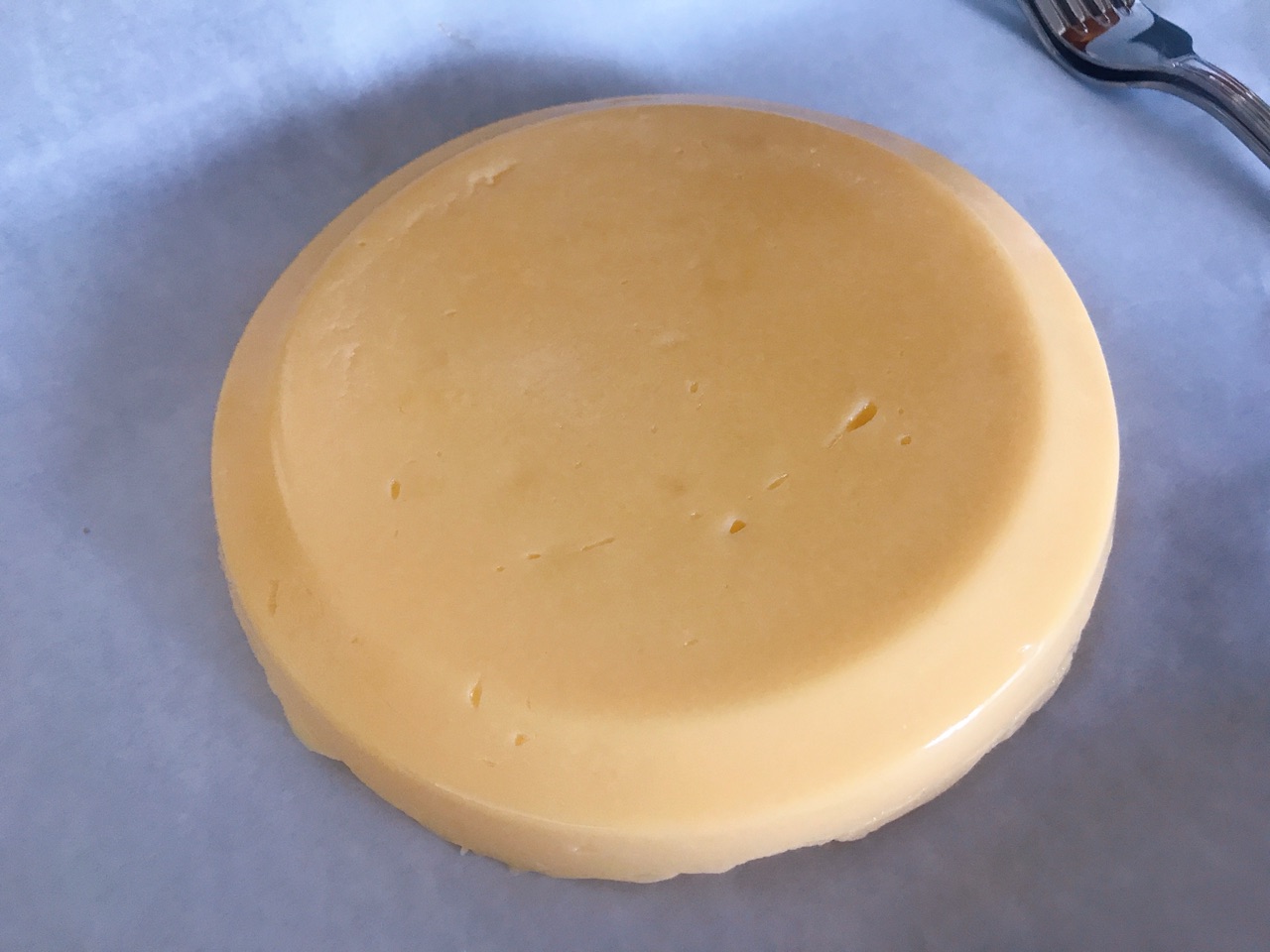 步骤3、冷藏好后将容器倒扣在硅油纸上倒出将布丁状食材切块