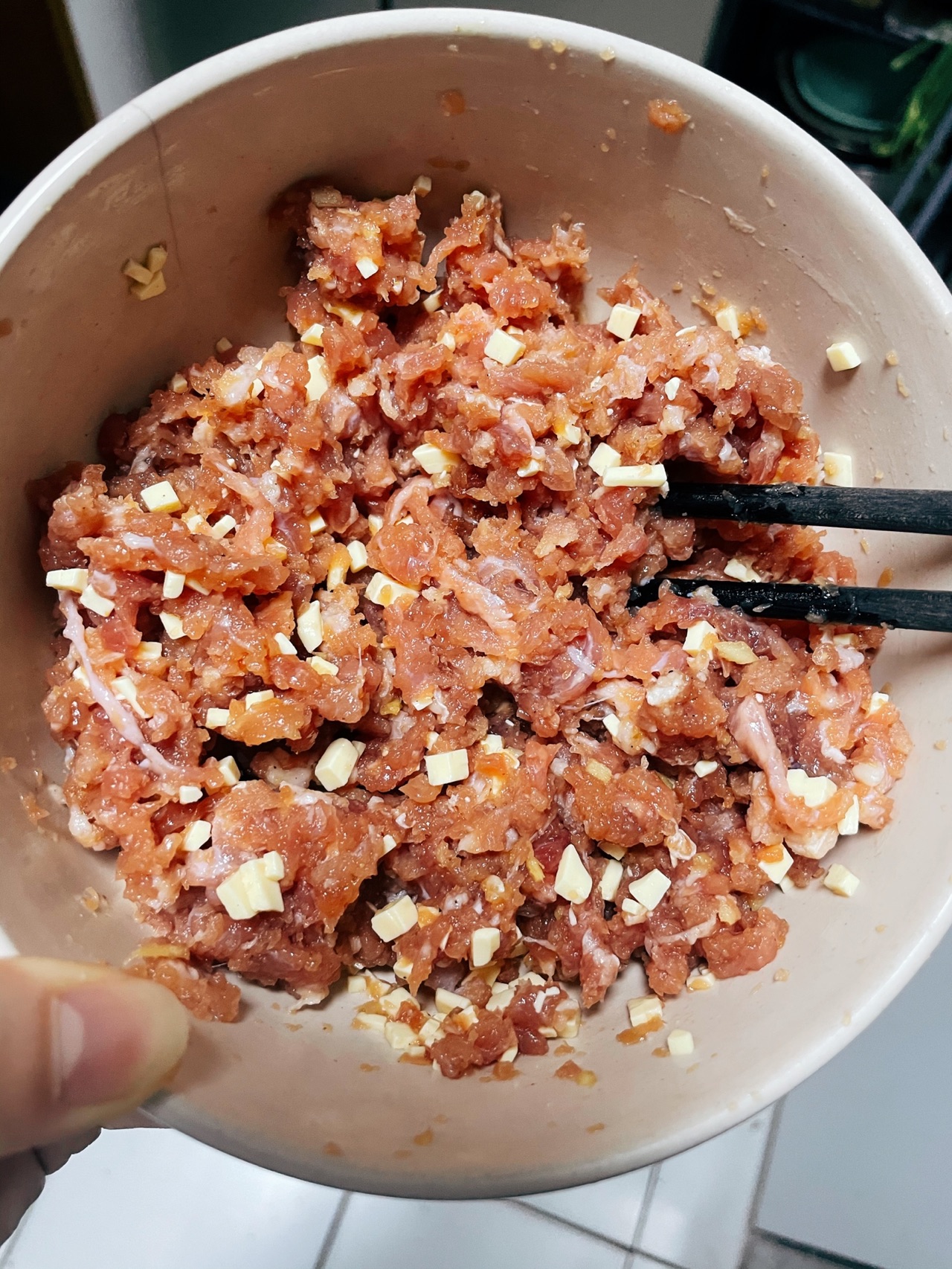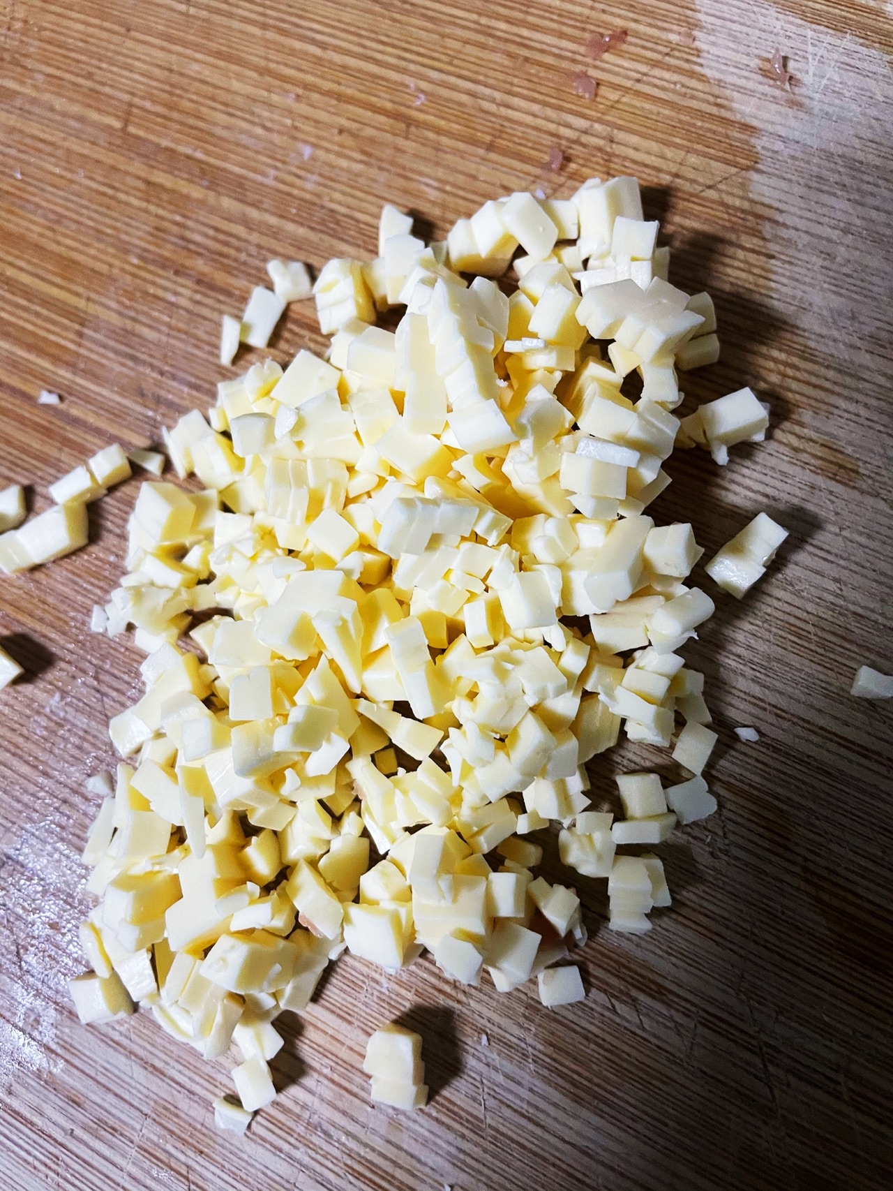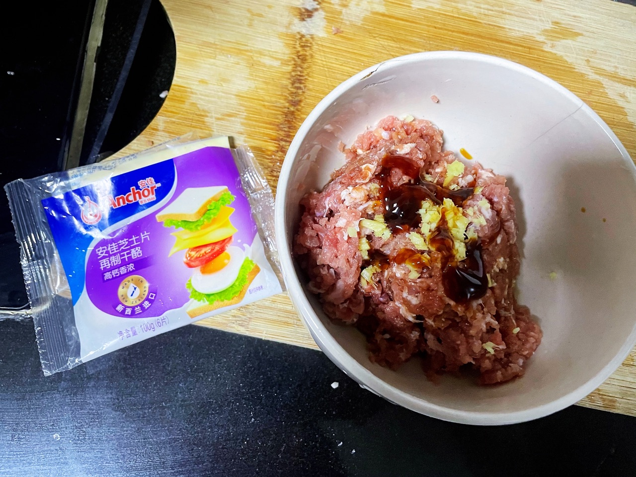 步骤4、腌制好的牛肉馅加入芝士碎,调匀