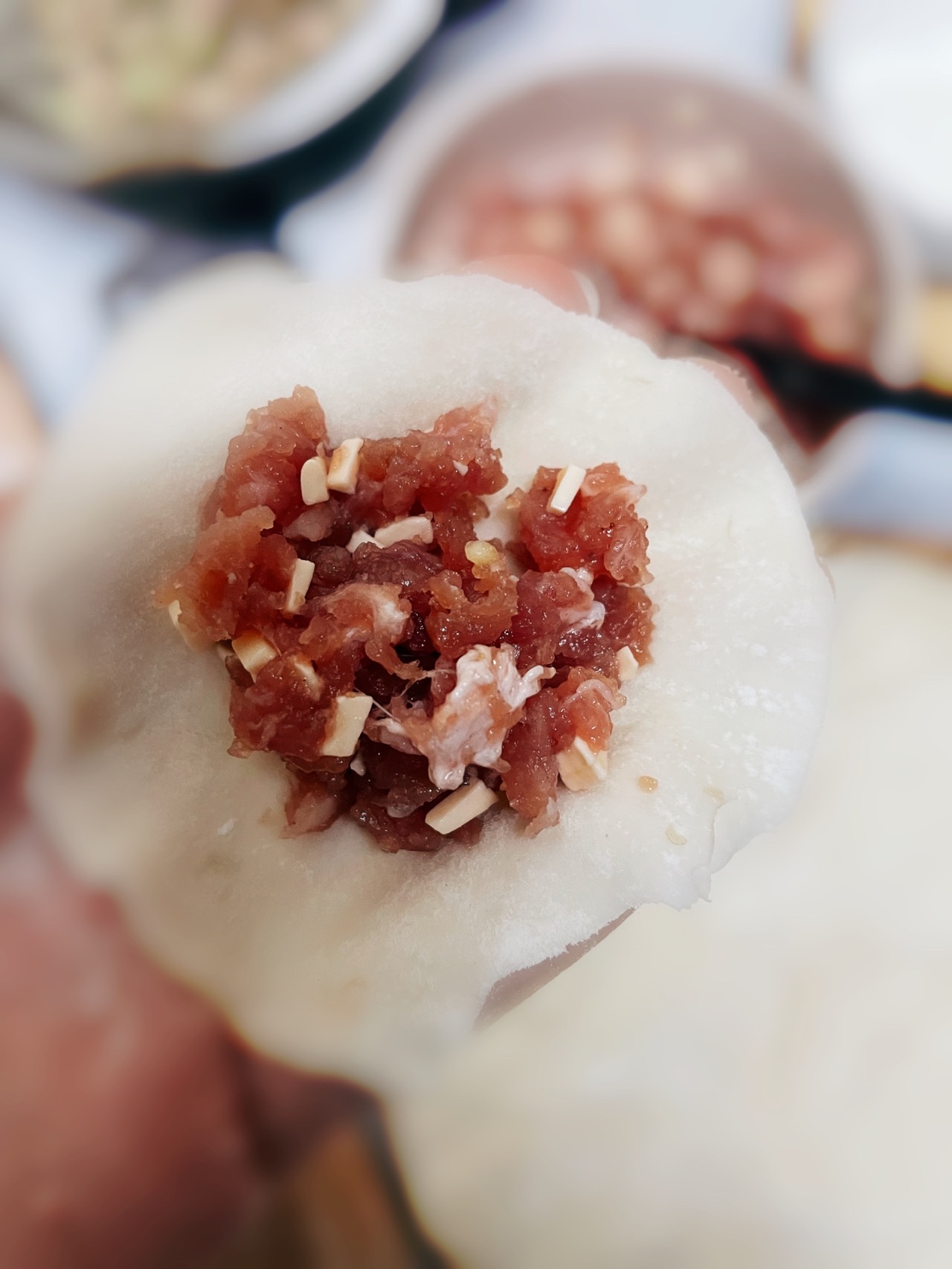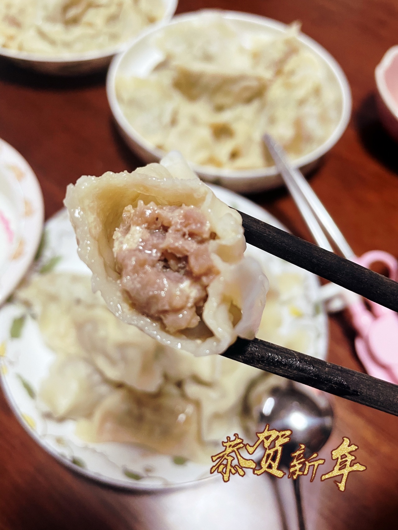步骤5、事先和好的面团(面粉加盐加一个鸡蛋清加水揉成面团,放电暖气上温热30分钟)制作好饺子皮,开包