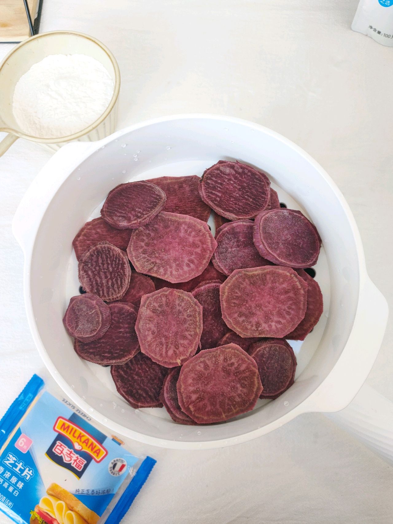 辅料:紫薯150克、椰蓉适量、芝士片6片