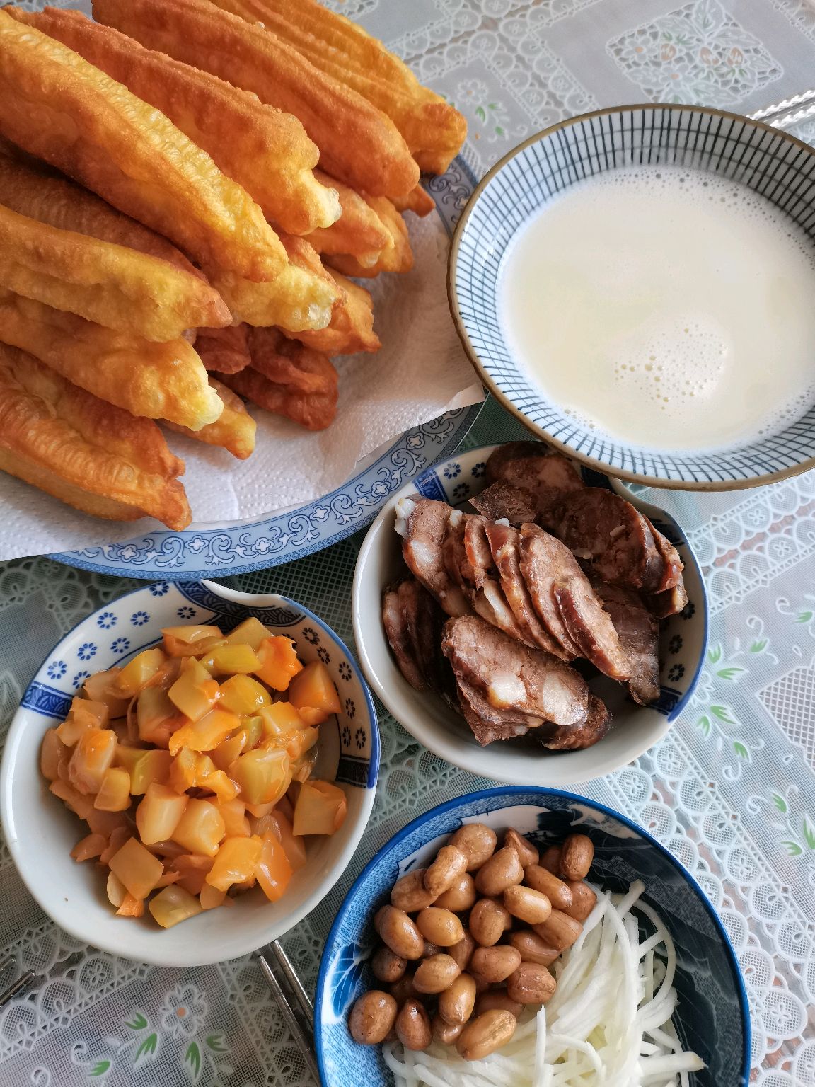 儿子回国,又是一年新春佳节。今天早餐我给炸个油条吃,喝个豆浆,小咸菜,吃中式早餐,家的味道。