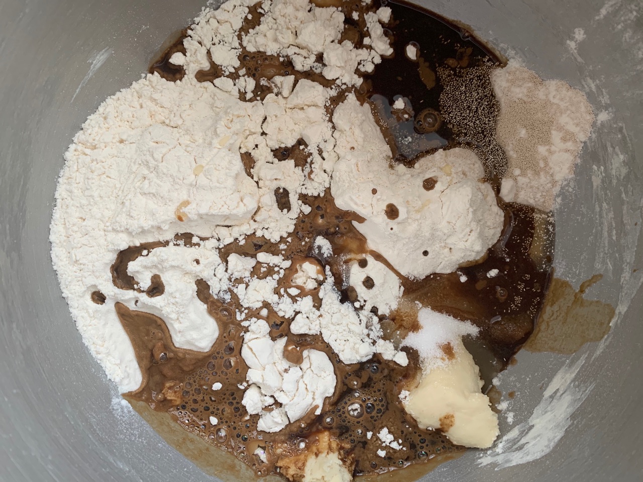 辅料:奶粉10克、高粉350克、酵母4克、主面团、高粉150克、细砂糖60克、咖啡粉10、盐5克、酵母2克、蜂蜜40克、黄油50克、蛋液60克、牛奶40毫升