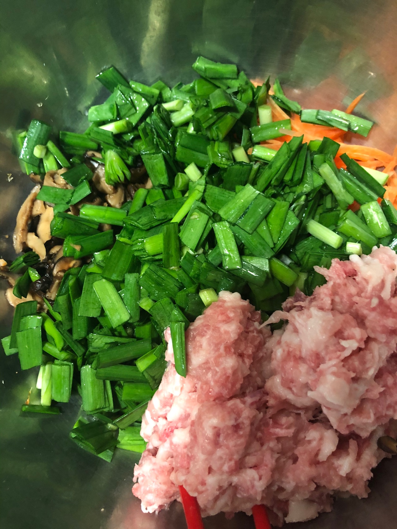 步骤2、猪肉末与韭菜段,胡萝卜丝,香菇粒加入盐一起搅拌,