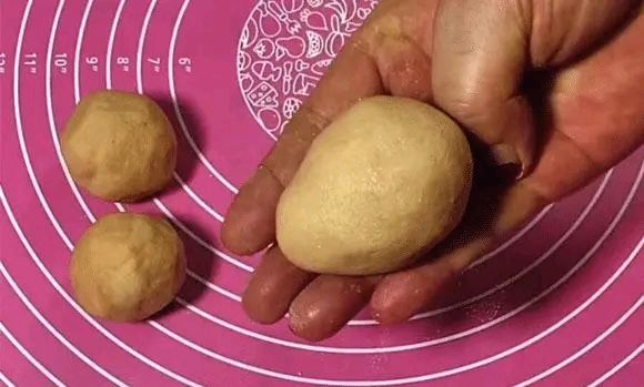 步骤5、第五步:和好的土豆面团,放到案板上先揉成长条,再切成一个个等大的小剂子,然后按压成一个圆圆的饼状,取适量的猪肉酸菜馅,将它放到上面,包起来,团成一个鸡蛋大小的椭圆形,如下图所示的样子。