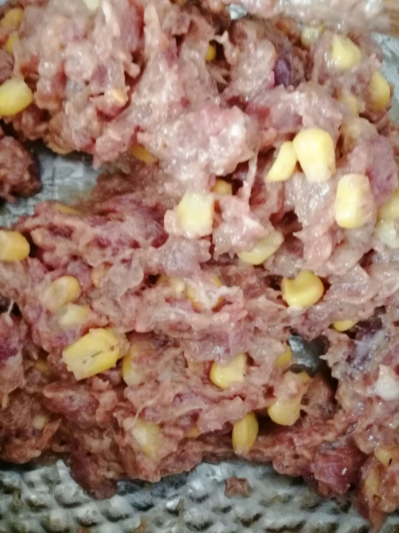 步骤2、将肉馅和玉米放入盆中,加入调料