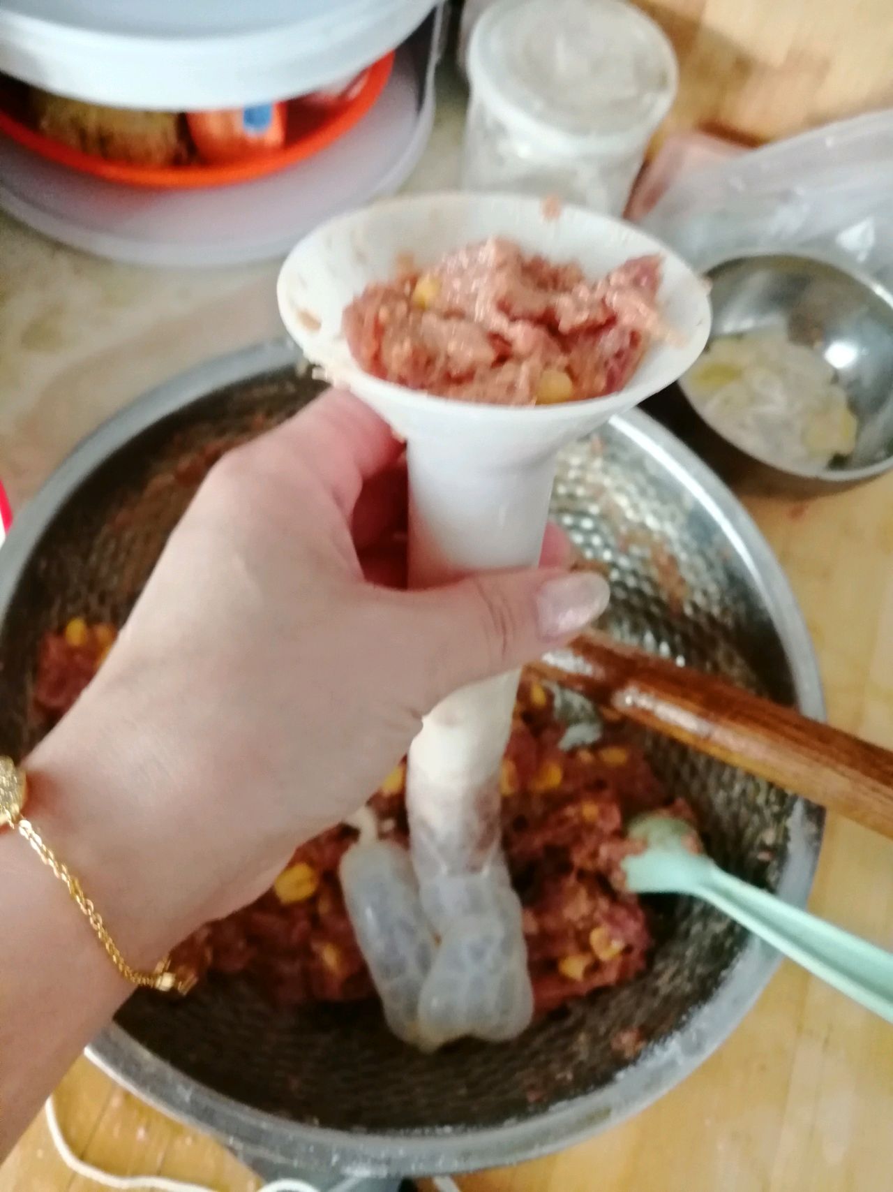 步骤5、馅放入漏斗里,用顺手的工具把馅放入肠衣里