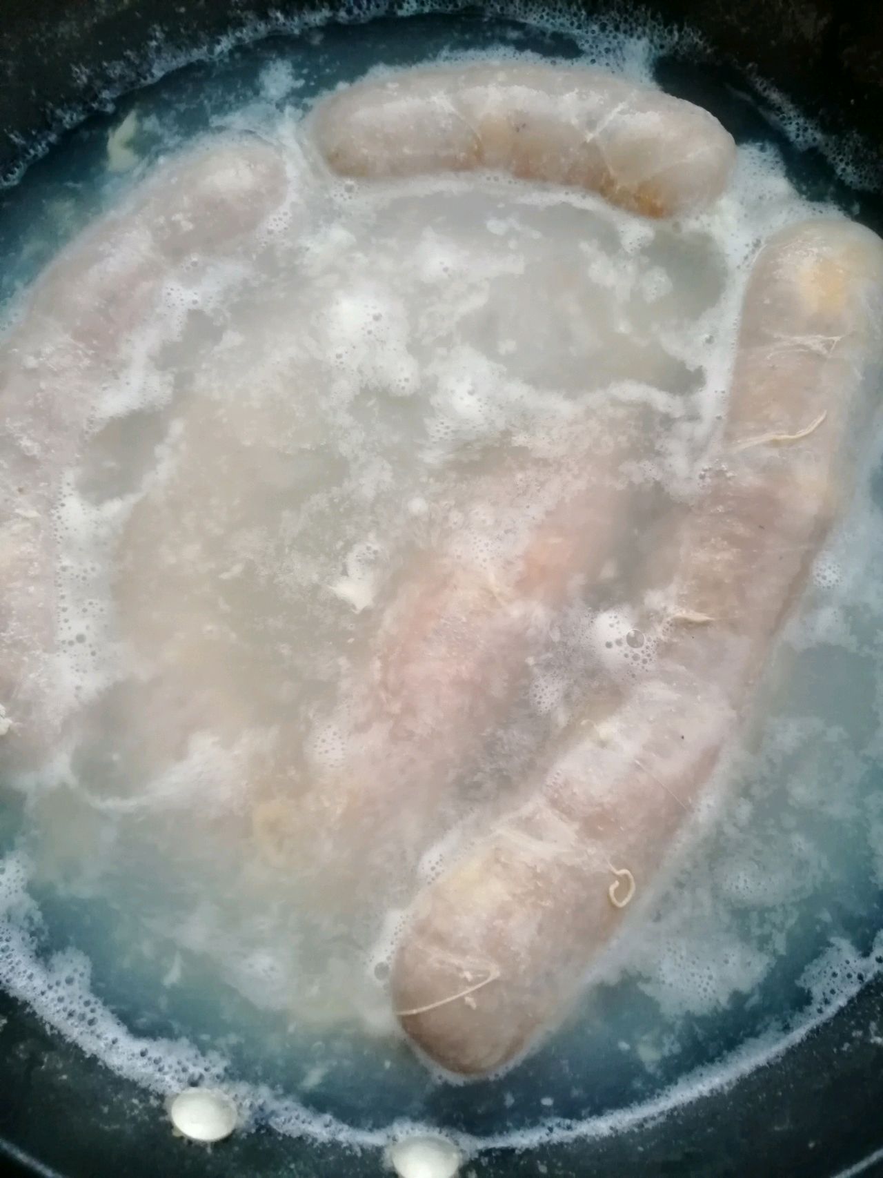步骤7、用牙签给晾好的肠扎孔(防止煮的时候表皮破裂),凉水入锅,中火煮开,改小火,微微冒泡即可,煮至香肠飘起,捞出晾凉,可冷冻保存,