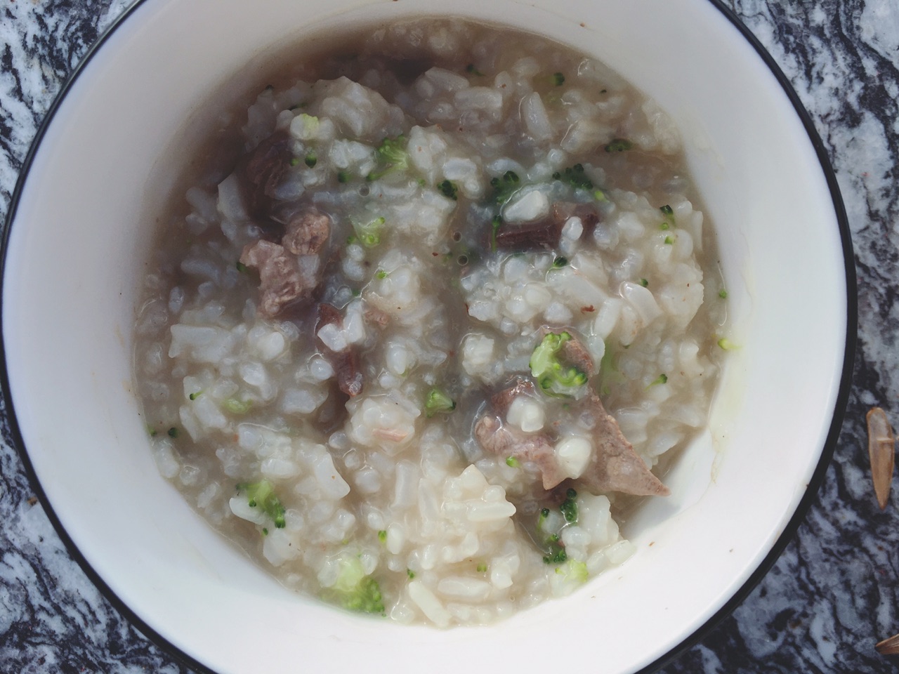 步骤4、大米洗干净后把猪杂和西蓝花加入锅里煮半个小时