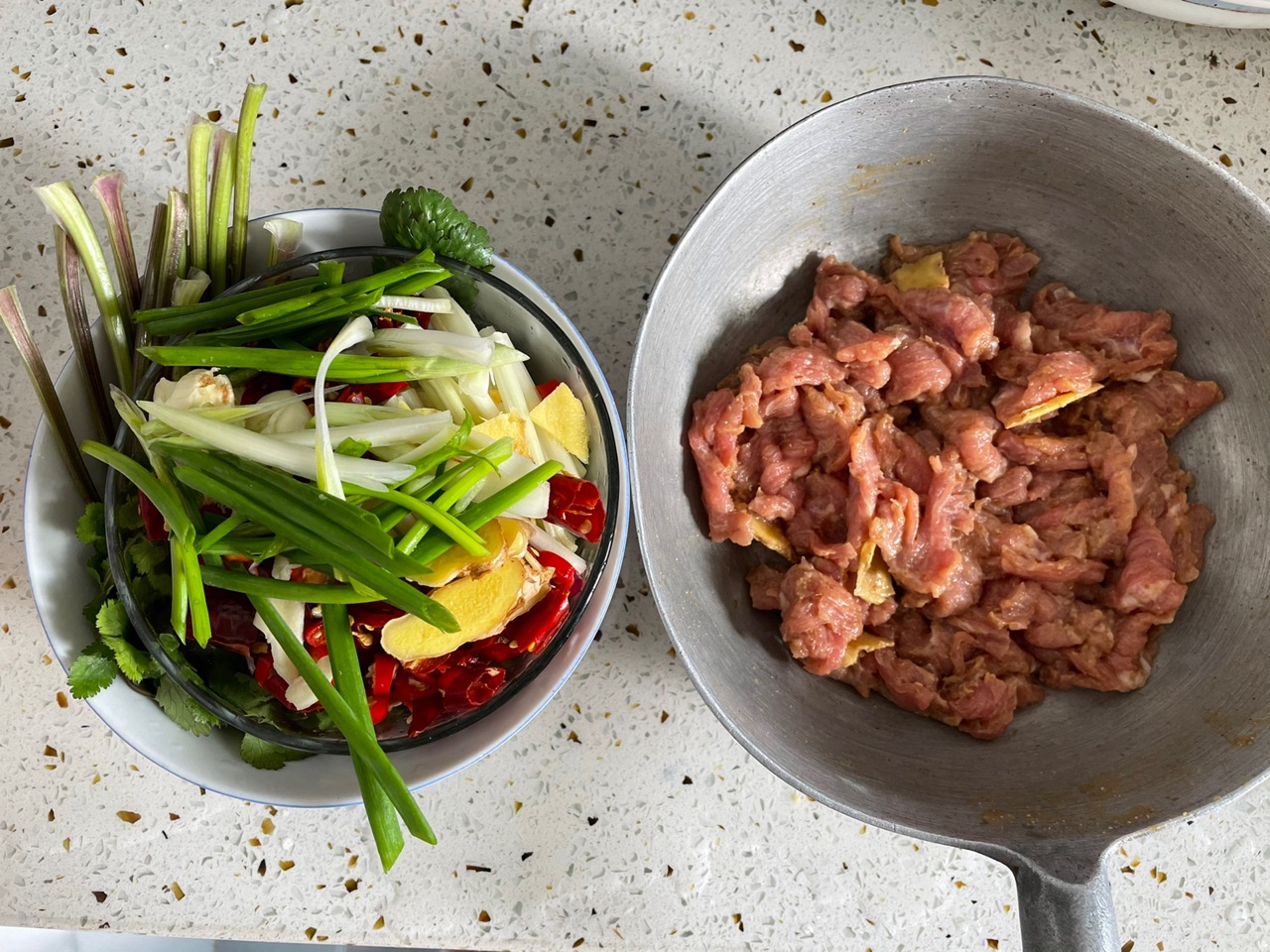 步骤1、牛肉切薄片,放入柠檬片、姜片清洗血水去腥(重复清洗至无血水,取出柠檬片,姜片不用取出)把牛肉控干水分,可用手稍挤干水