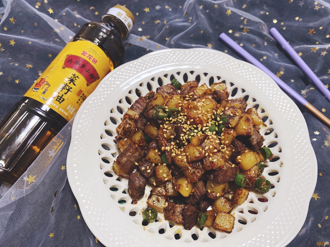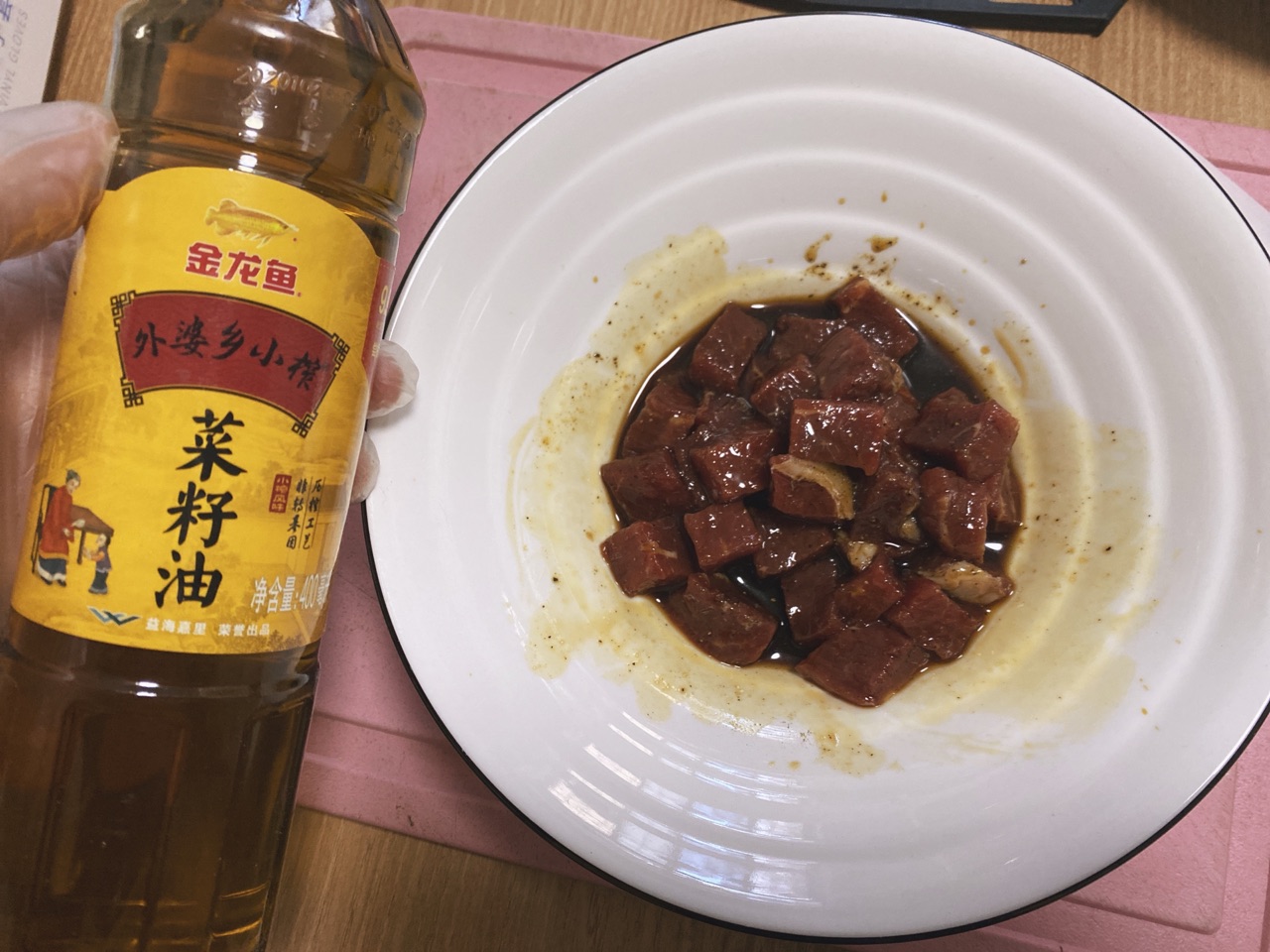 步骤3、倒入适量金龙鱼外婆香小榨菜籽油这样牛肉在下锅翻炒的时候不会粘在一起