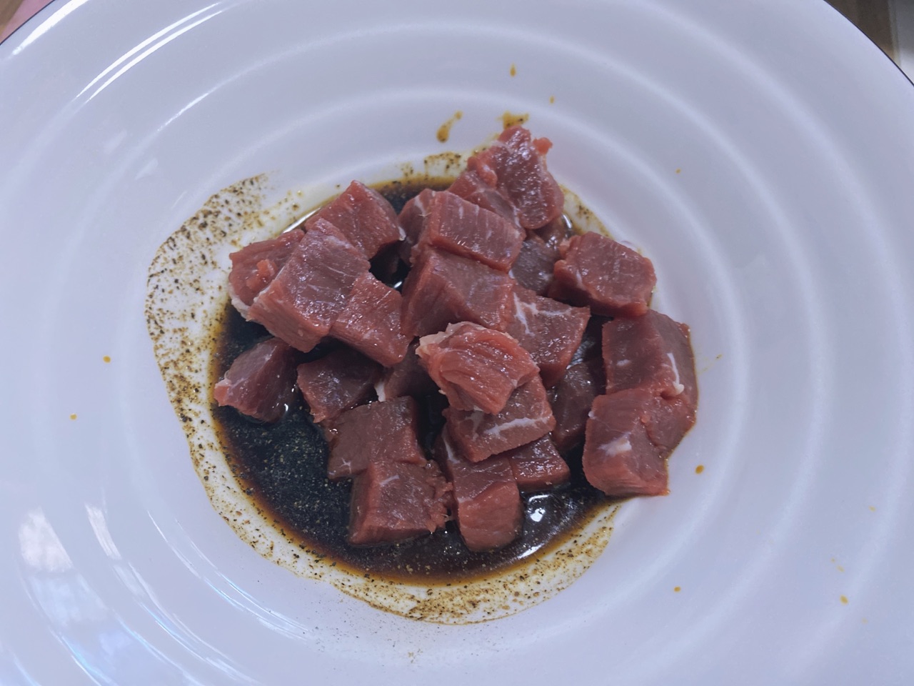 步骤2、牛肉切成小粒,放入腌料碗,抓匀