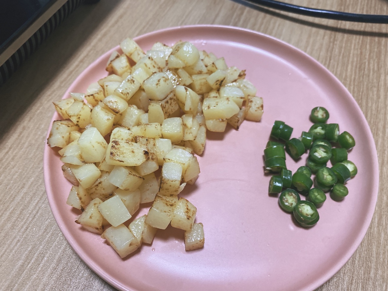 步骤4、土豆、线辣椒切小粒备用