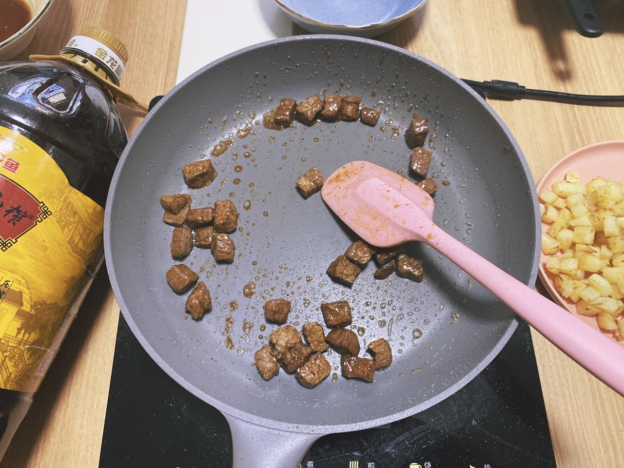 步骤8、将牛肉放入下锅翻炒至断生(剩下的腌料不放入)