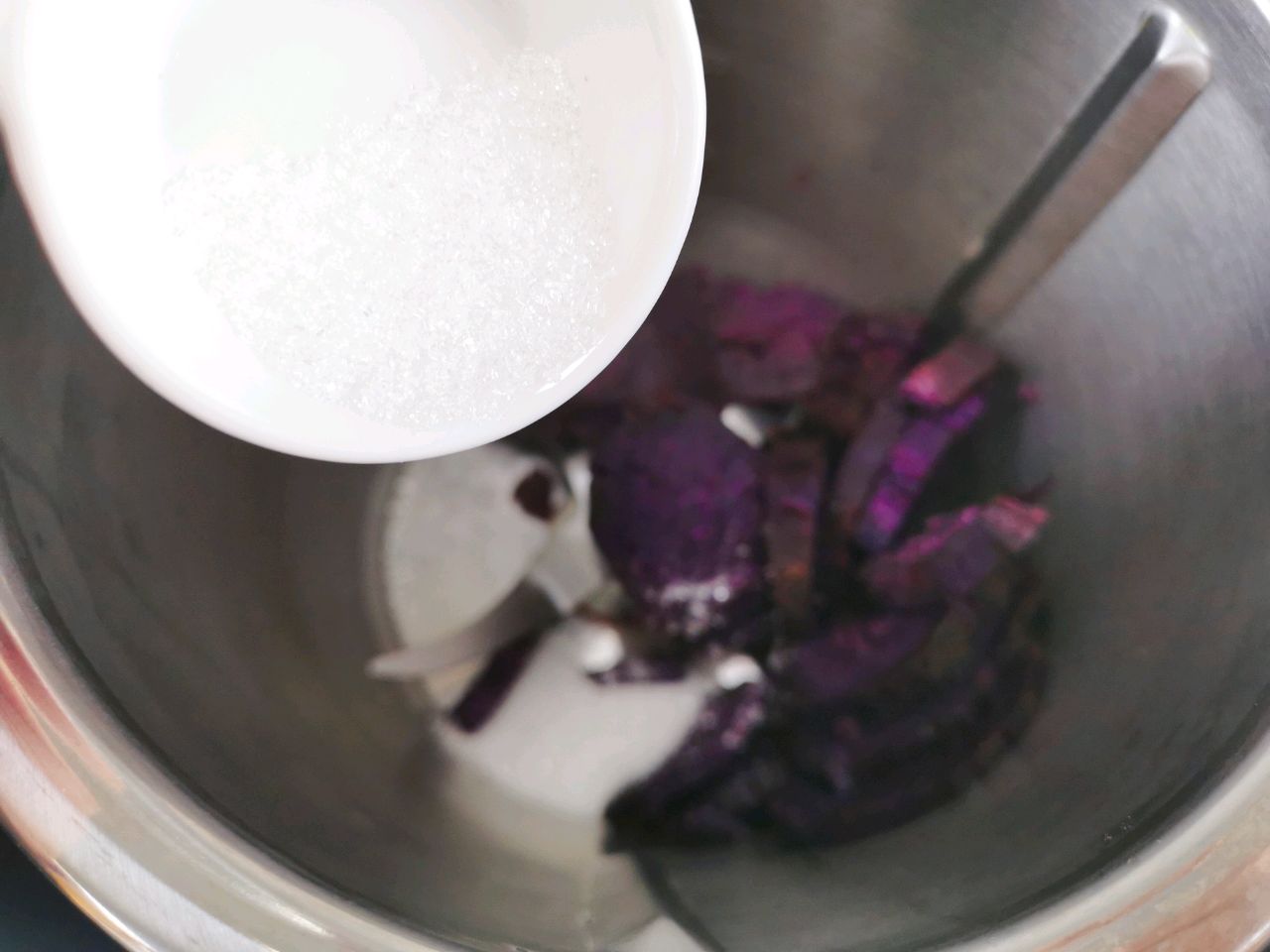 步骤3、蒸熟的紫薯放进主锅里,倒入白砂糖,少许牛奶