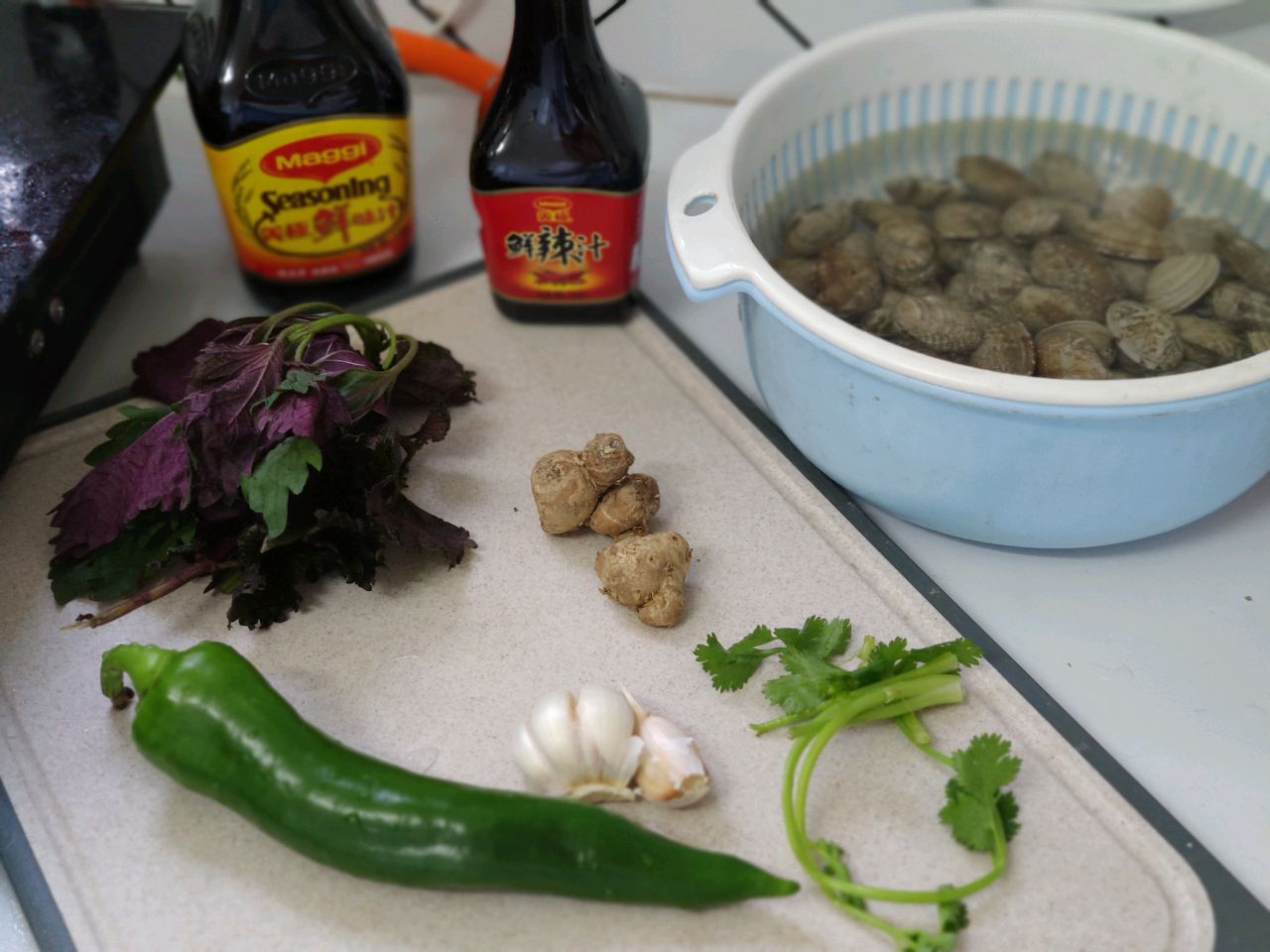 辅料:蒜蓉3-4瓣、沙姜少许、青椒一个、紫苏叶4-5片、调味料:、味极鲜味汁2-3勺、料酒2勺、盐一小撮、白糖一勺、鲜辣汁2勺、生粉(勾芡)一勺