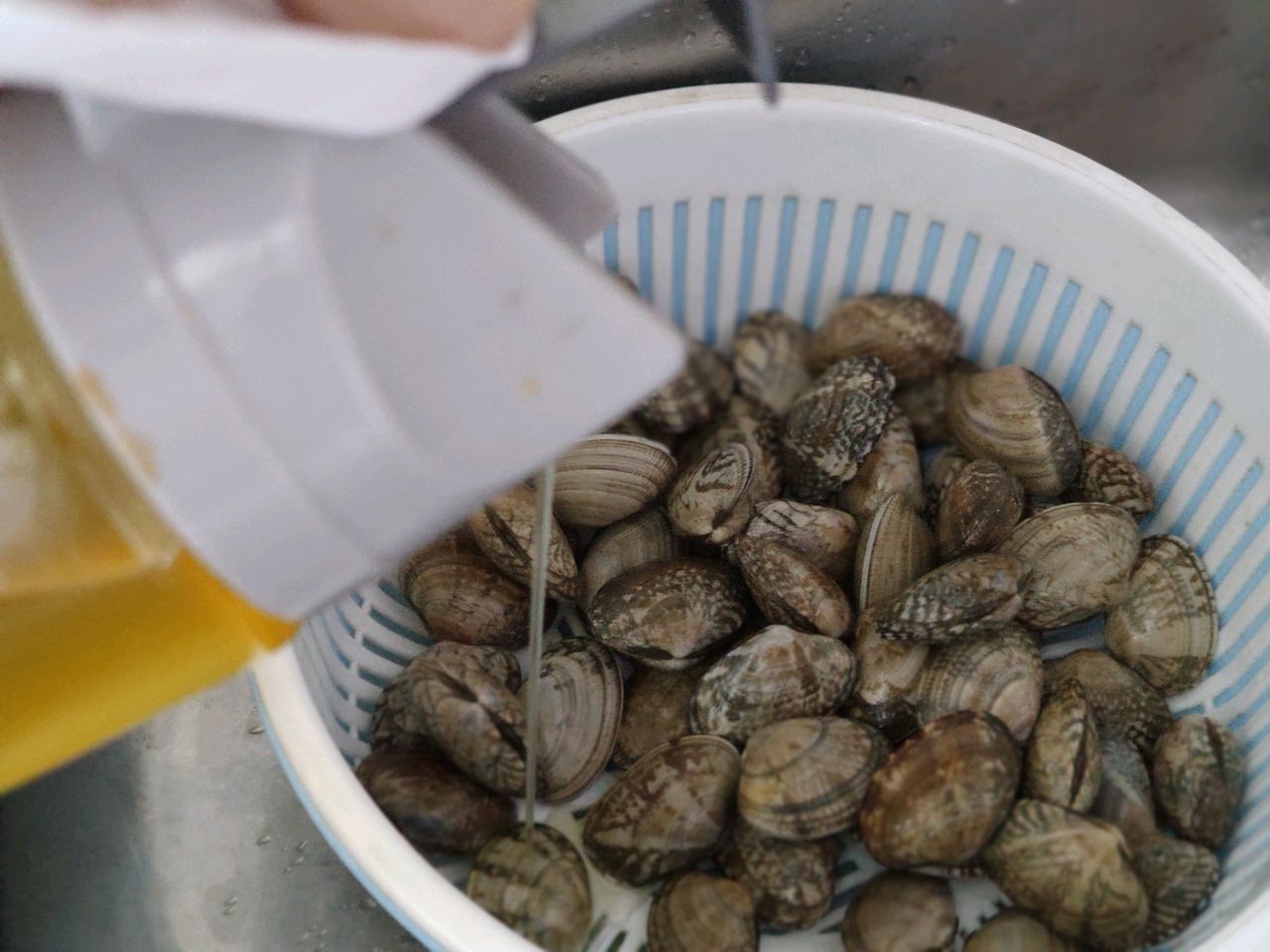 步骤2、花甲买回来后加入少许食用油、少许盐、清水浸泡半小时吐沙