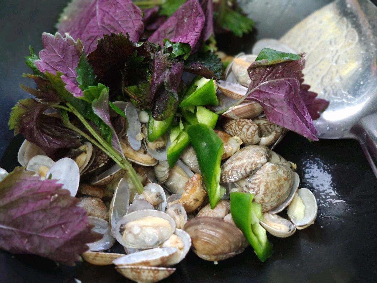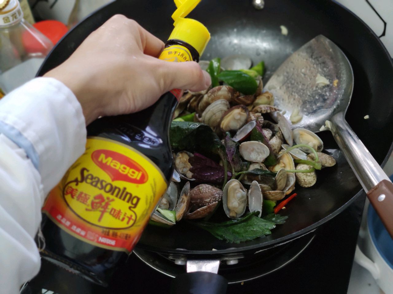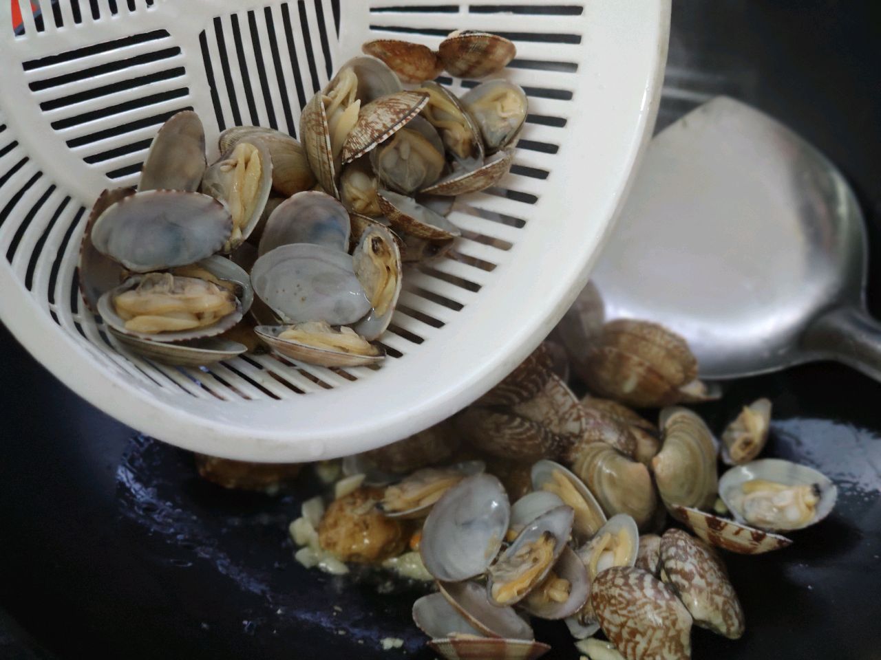 步骤6、加入花甲翻炒