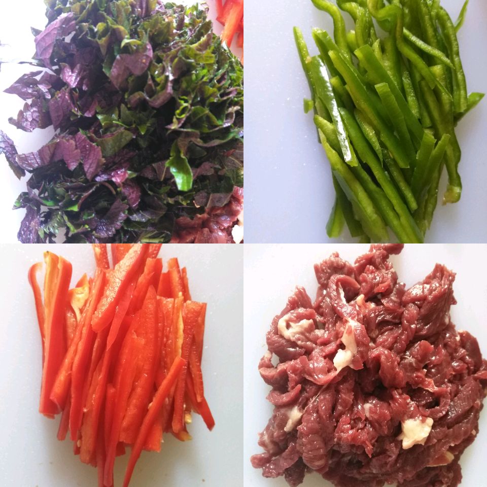 步骤1、紫苏,青椒,红椒和牛肉切丝备用。