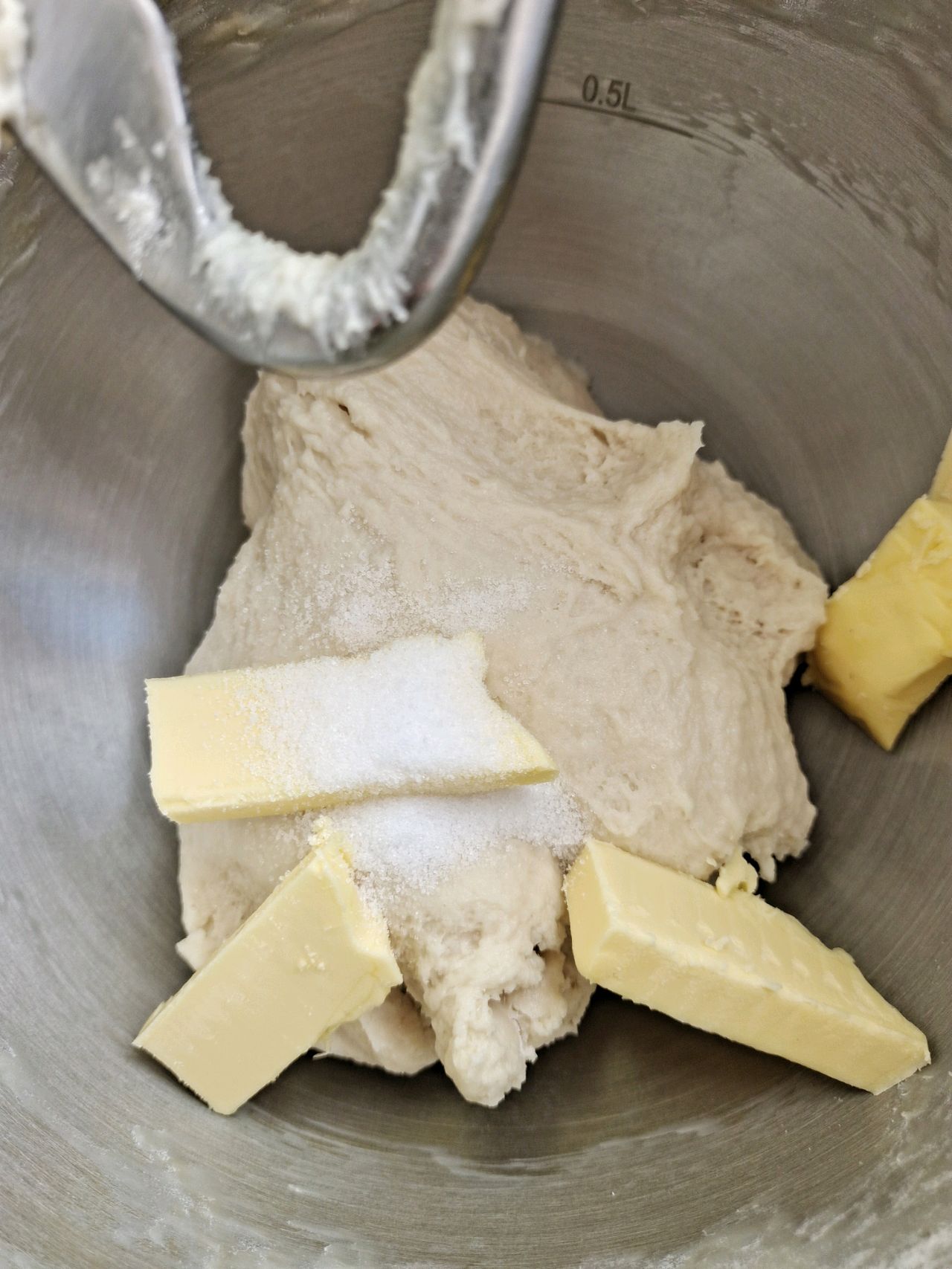 步骤2、除了黄油和盐以外的全部食材都放入Beko倍科厨师机K6里(牛奶留10毫升左右,面粉不一样吸水量不一样)先用2档揉2分钟再改用4档揉10分钟左右如果中途发现面团变成2个了,就说明干了,少量多次的加点牛奶