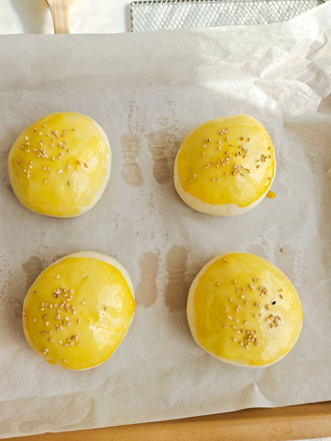 步骤6、好了之后表面涂上一层蛋黄液,撒上芝麻烤箱170度20分钟上色后盖上锡纸