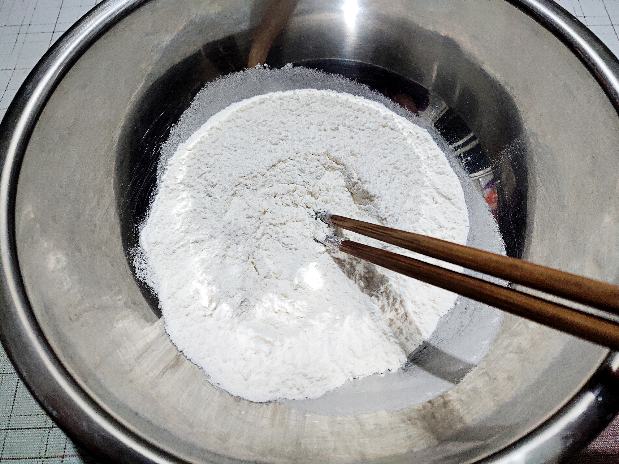 步骤1、一个干净的大盆,加入面粉和1克盐,先用筷子搅拌均匀。