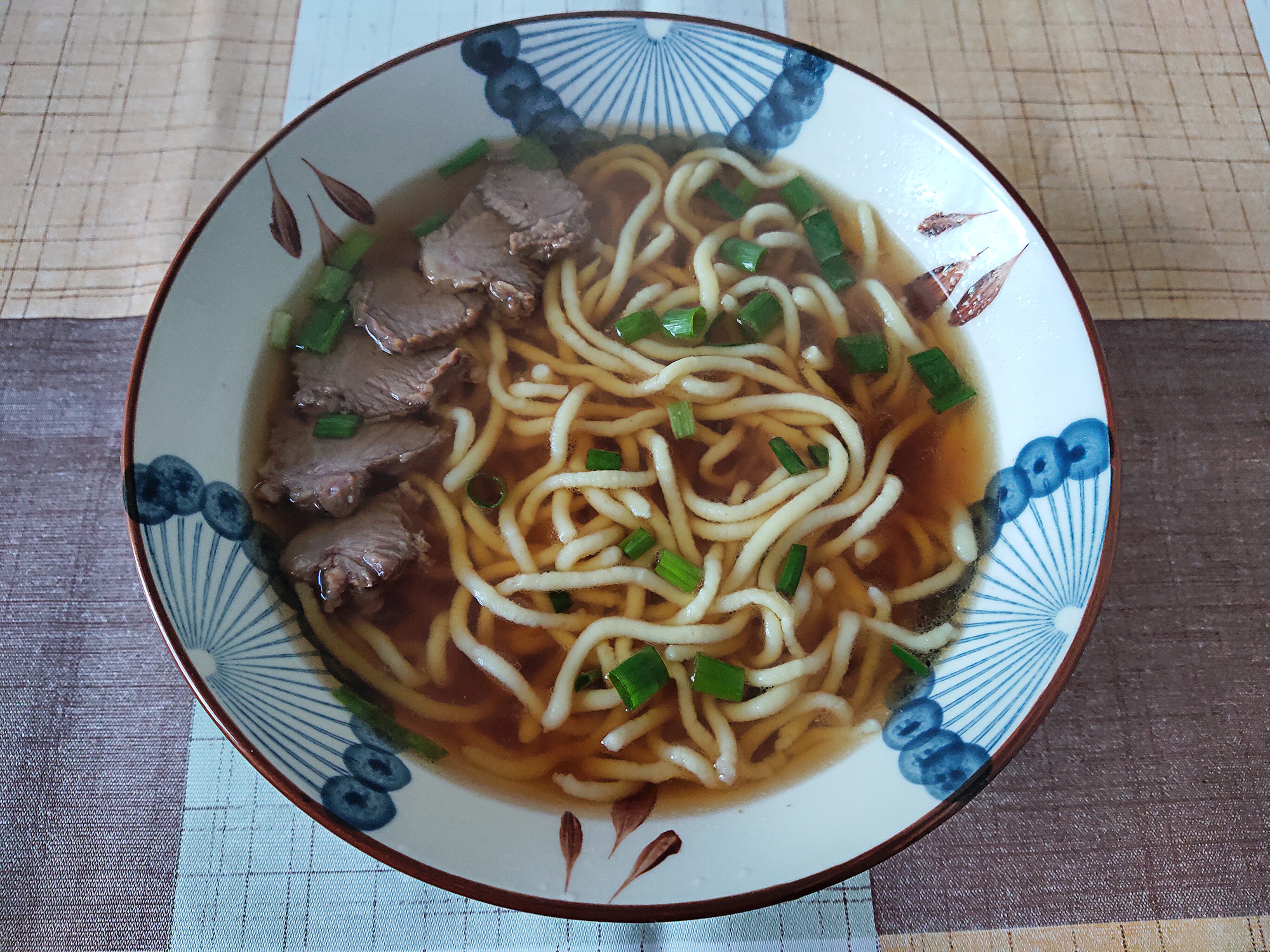 步骤9、浇上牛肉汤,码上几片卤牛肉,洒一点葱花,就好了。或者根据自己的喜好调配底汤。