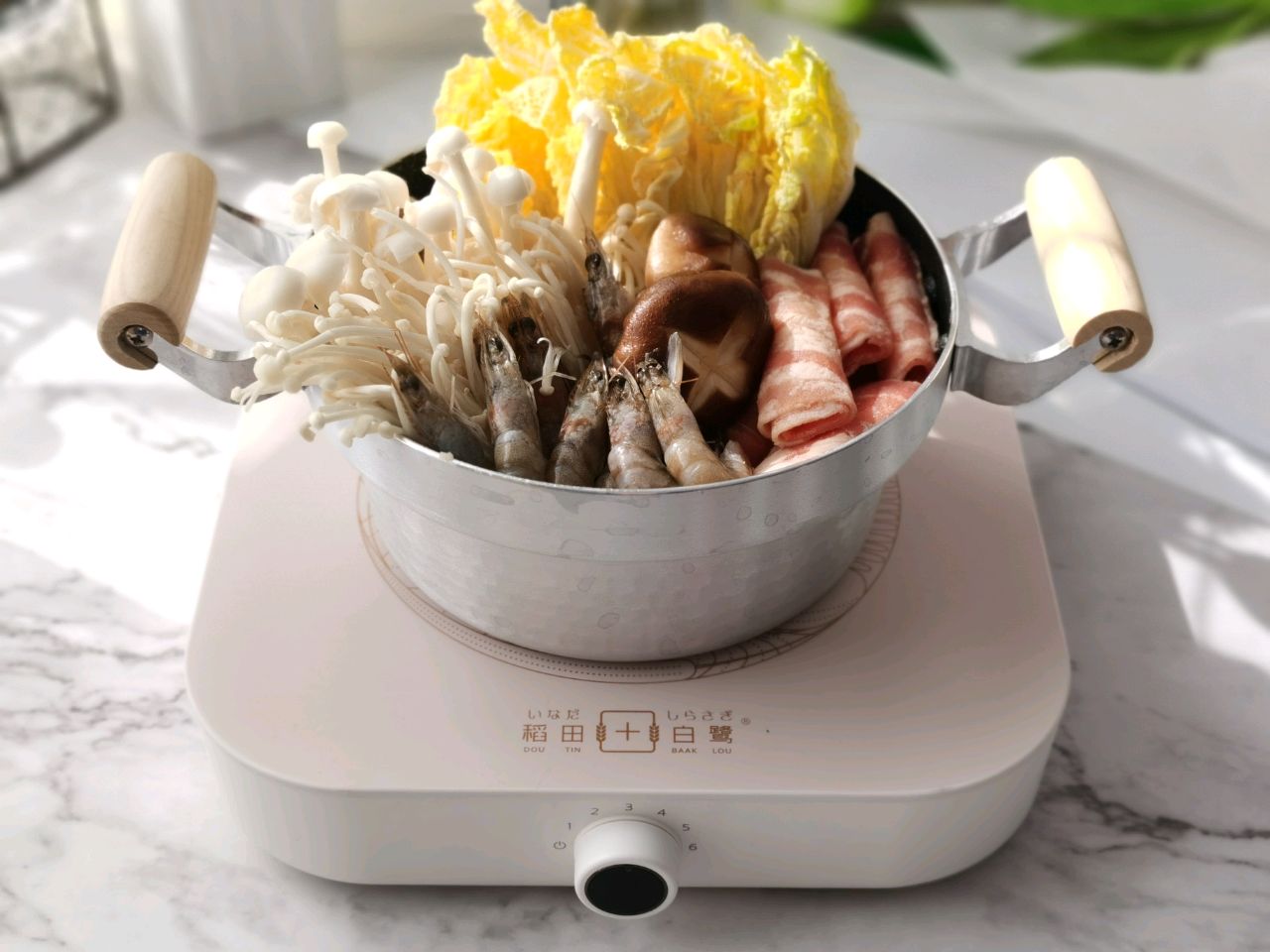 辅料:香菇3朵、金针菇80克、大虾8只、火锅丸子200克、稻田白鹭日式寿喜锅调味汁3勺