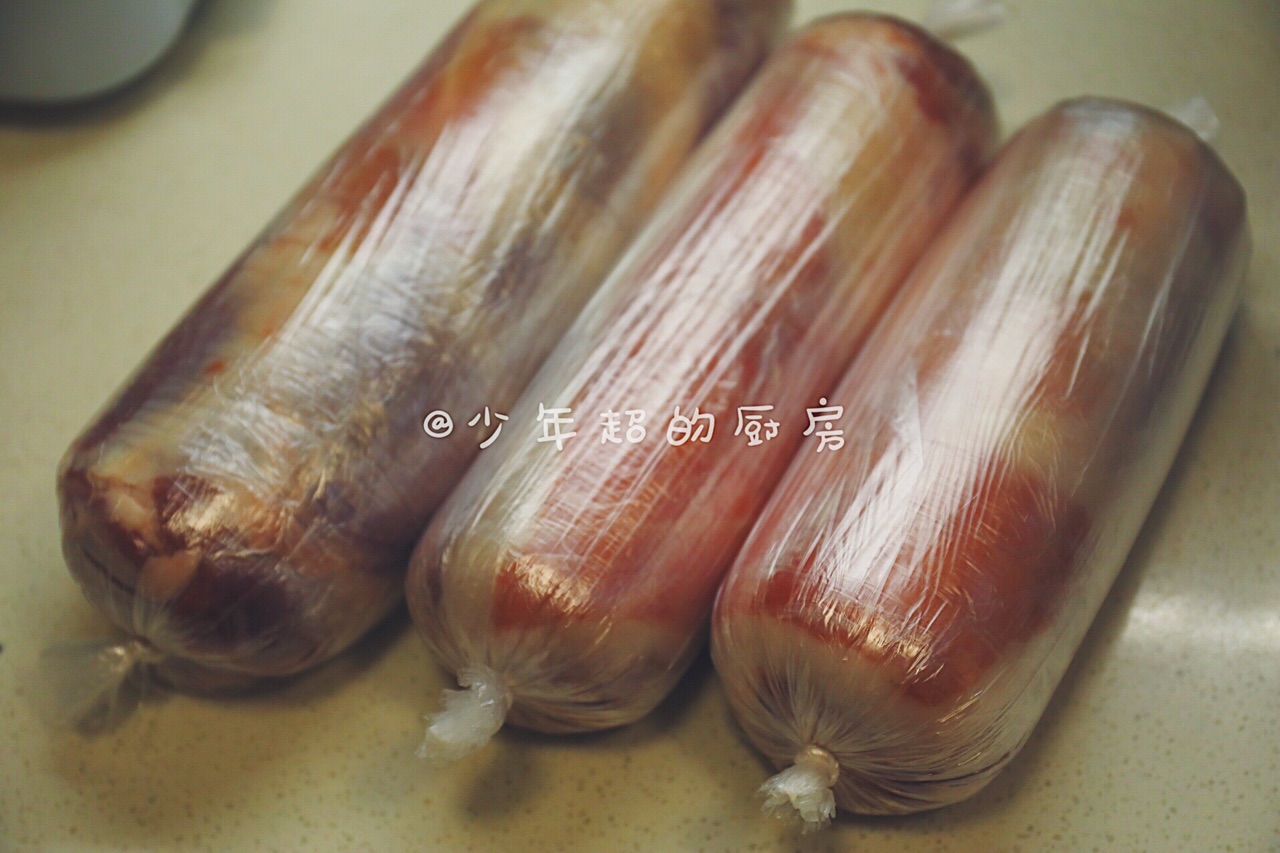 步骤2、用保鲜膜或者塑料袋把羊肉卷成卷,注意控制一下厚度,卷太粗了不好切。