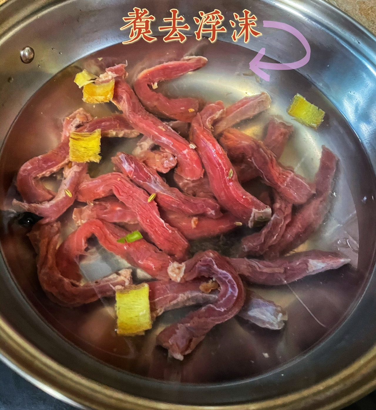 新疆传统牛肉干家常自制,椒香,麻香加孜然香,劲道十足。
